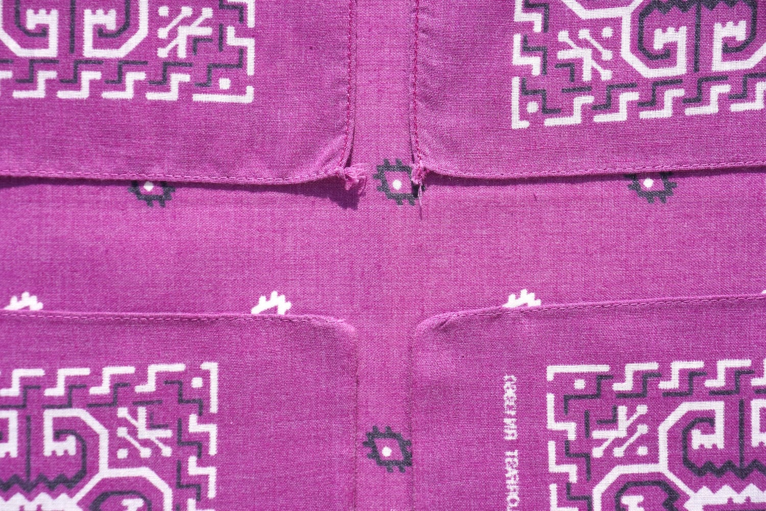 1辺チェーンステッチ、2辺シングルステッチ、1辺セルビッヂ(耳付き)。