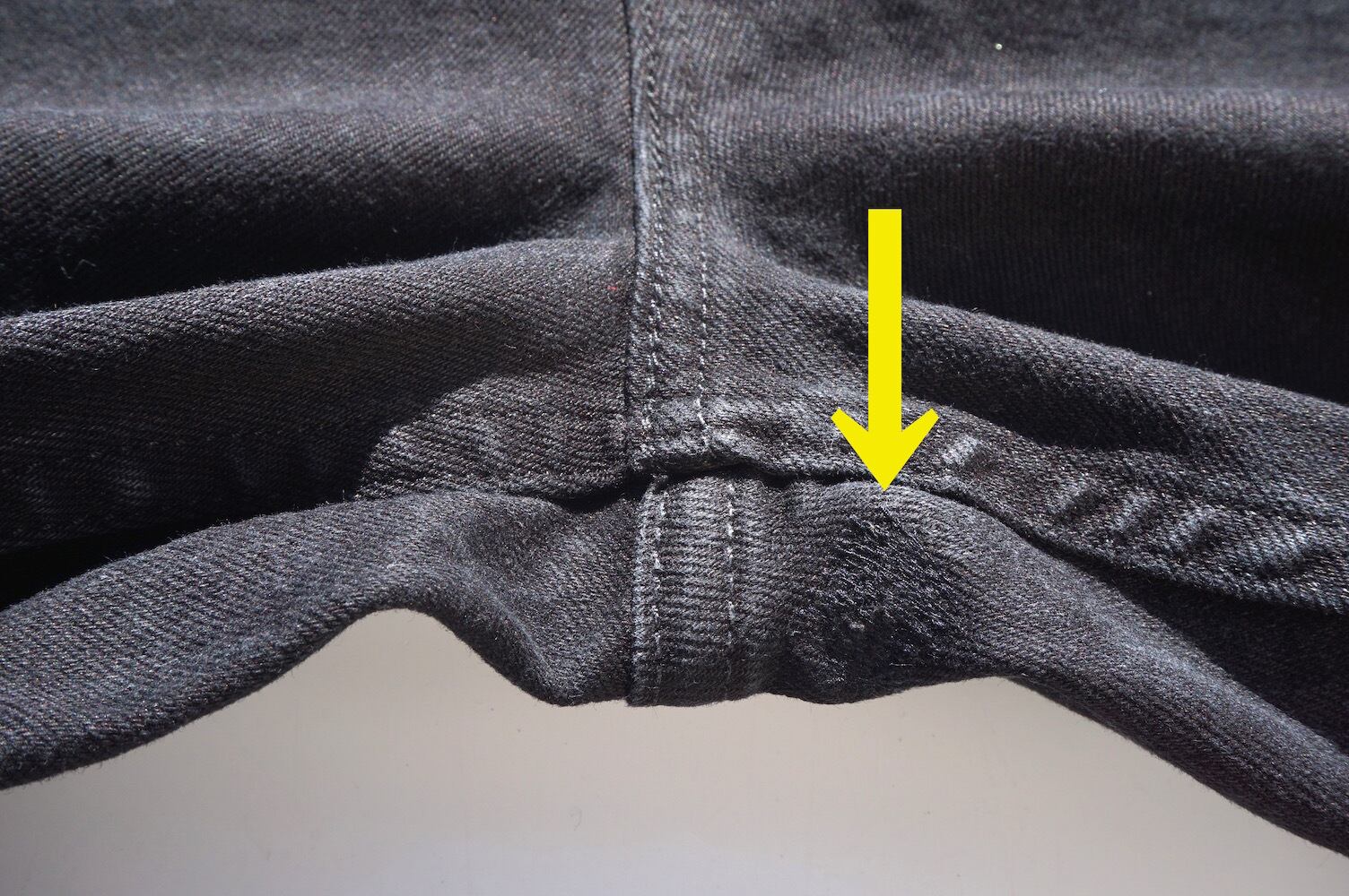 縫製後に染め上げる事でステッチや生地裏まで全て黒くなっている、後染めスーパーブラック。