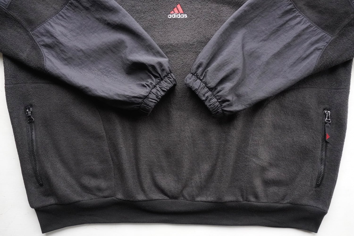 この年代らしい斬新なオーバーレイデザインの、モックネックフリースプルオーバー。