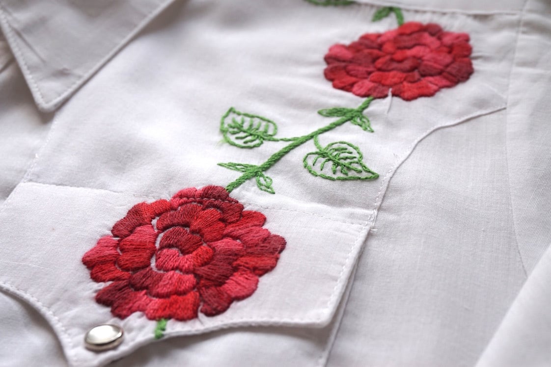 ヨークの赤い花の刺繍が映える、ホワイトのウエスタンシャツ。