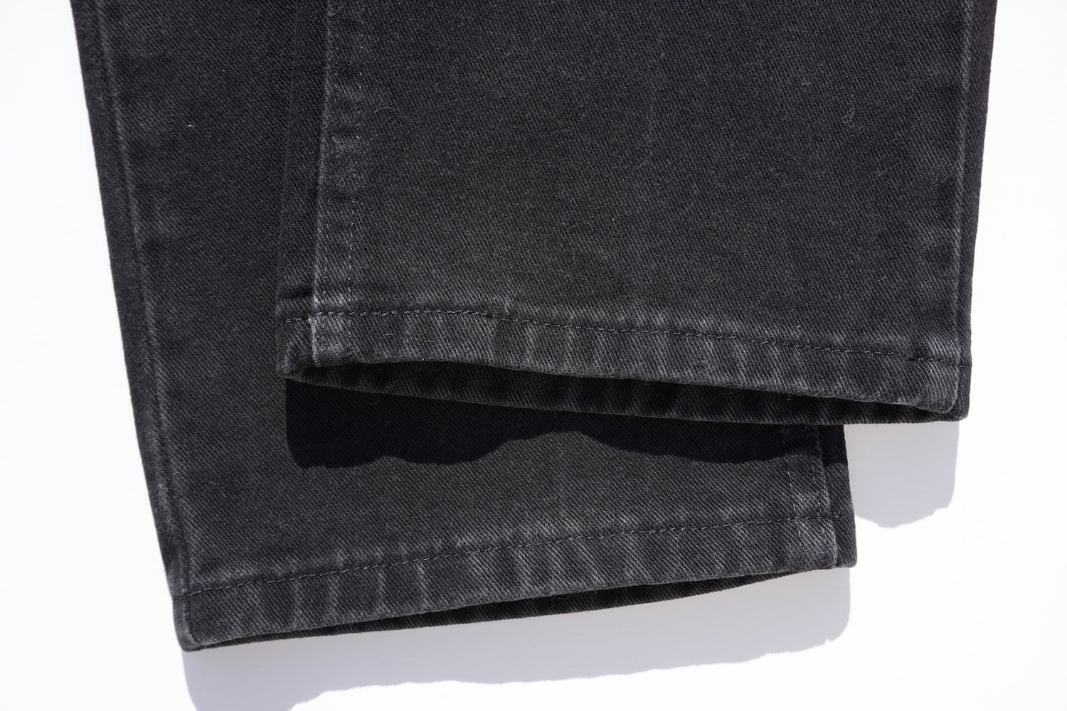 縫製後に染め上げる事でステッチや生地裏まで全て黒くなっている、後染めスーパーブラック。