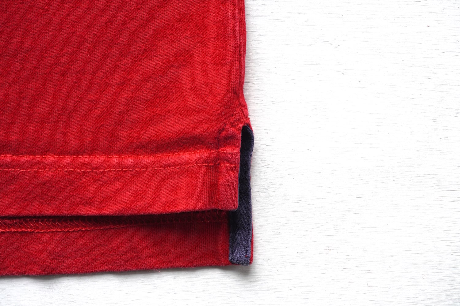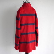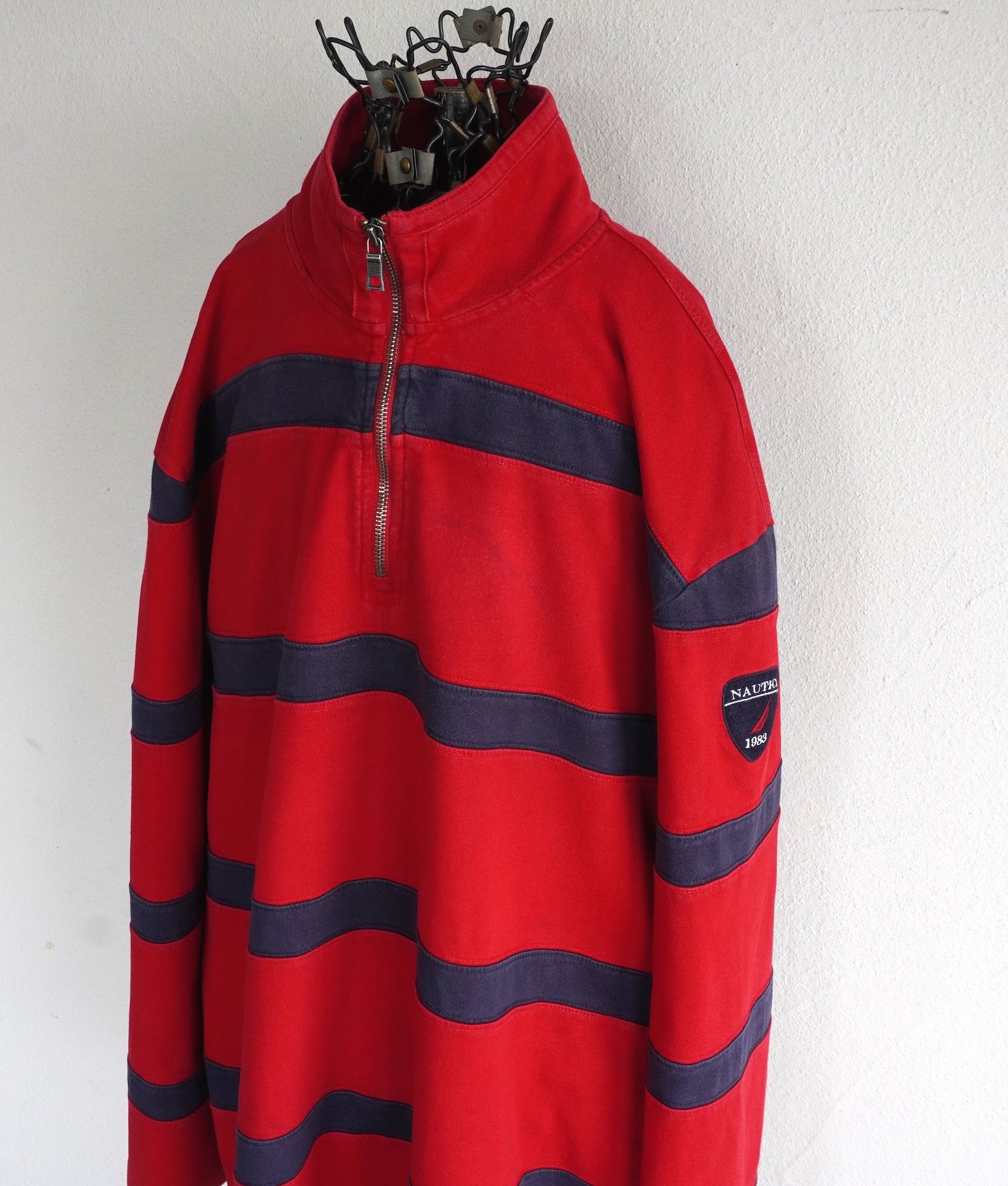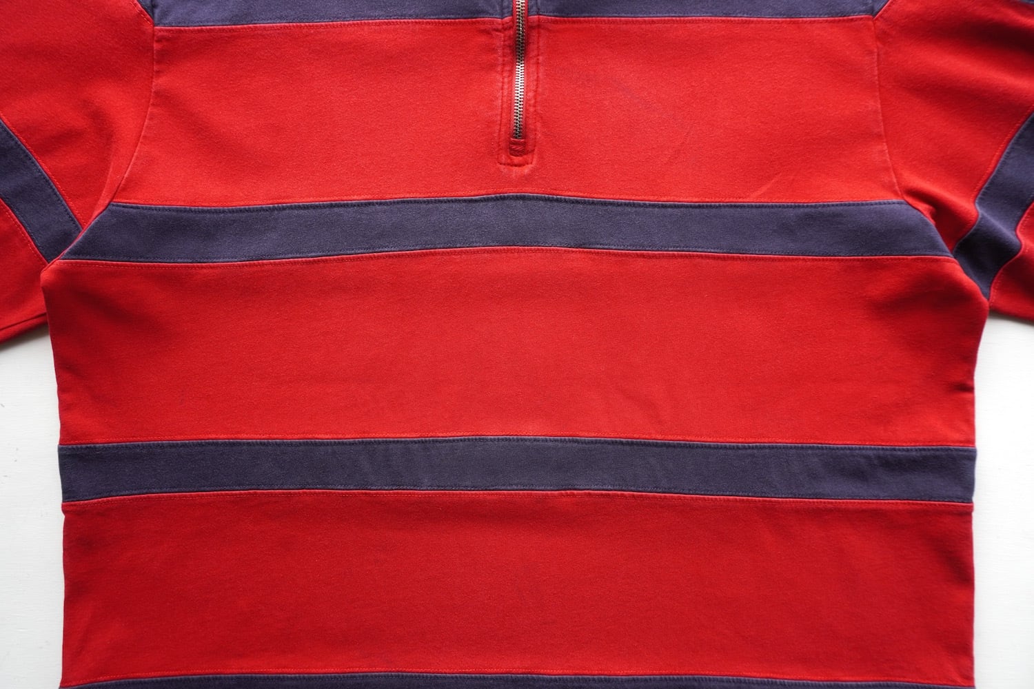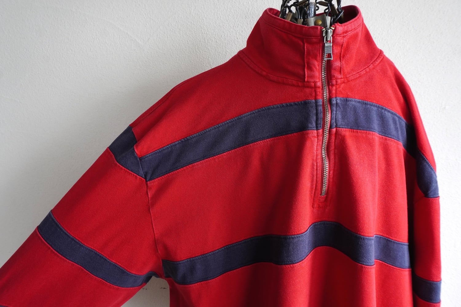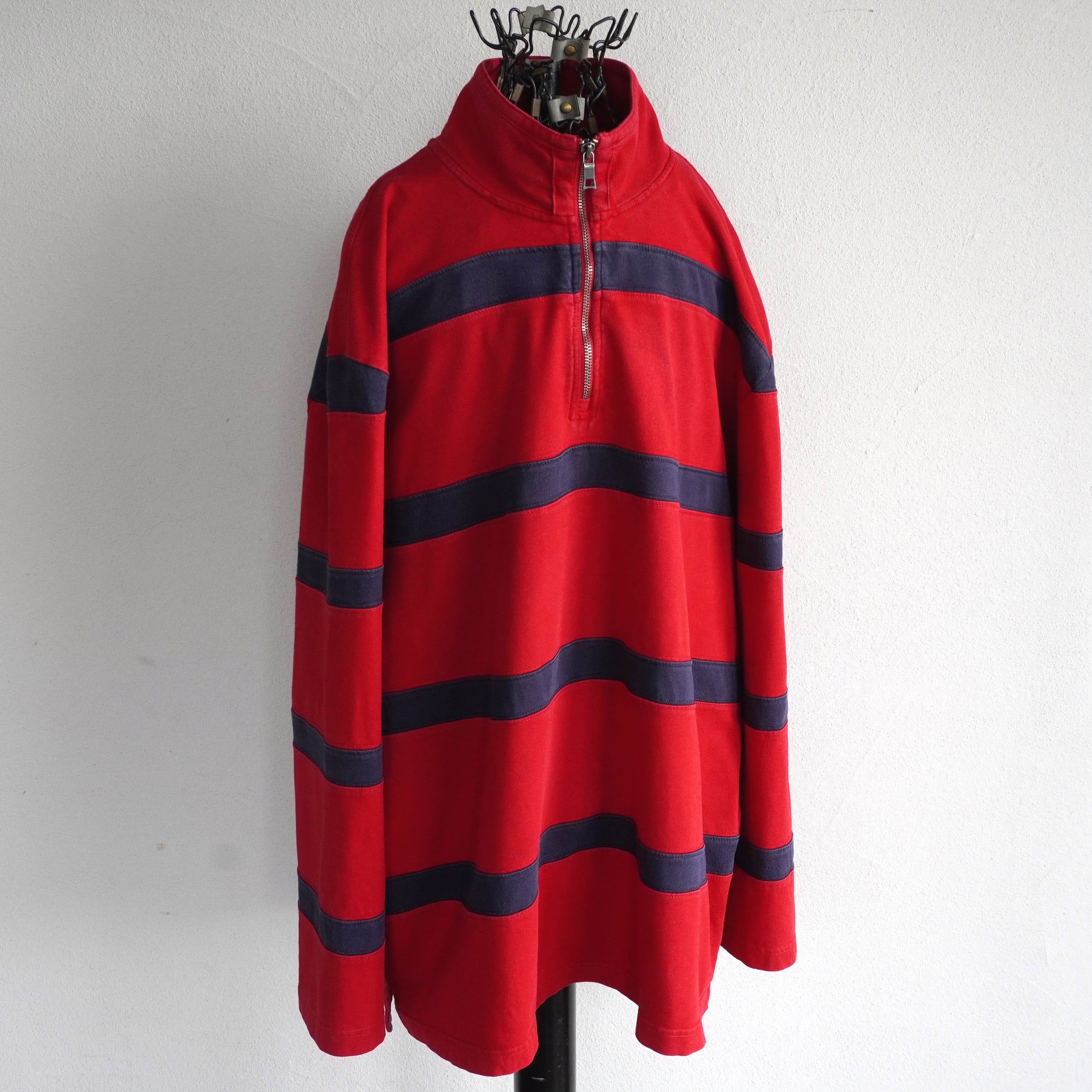 レッド×ネイビー切り替えボーダーの、ハーフジップコットンプルオーバー。
