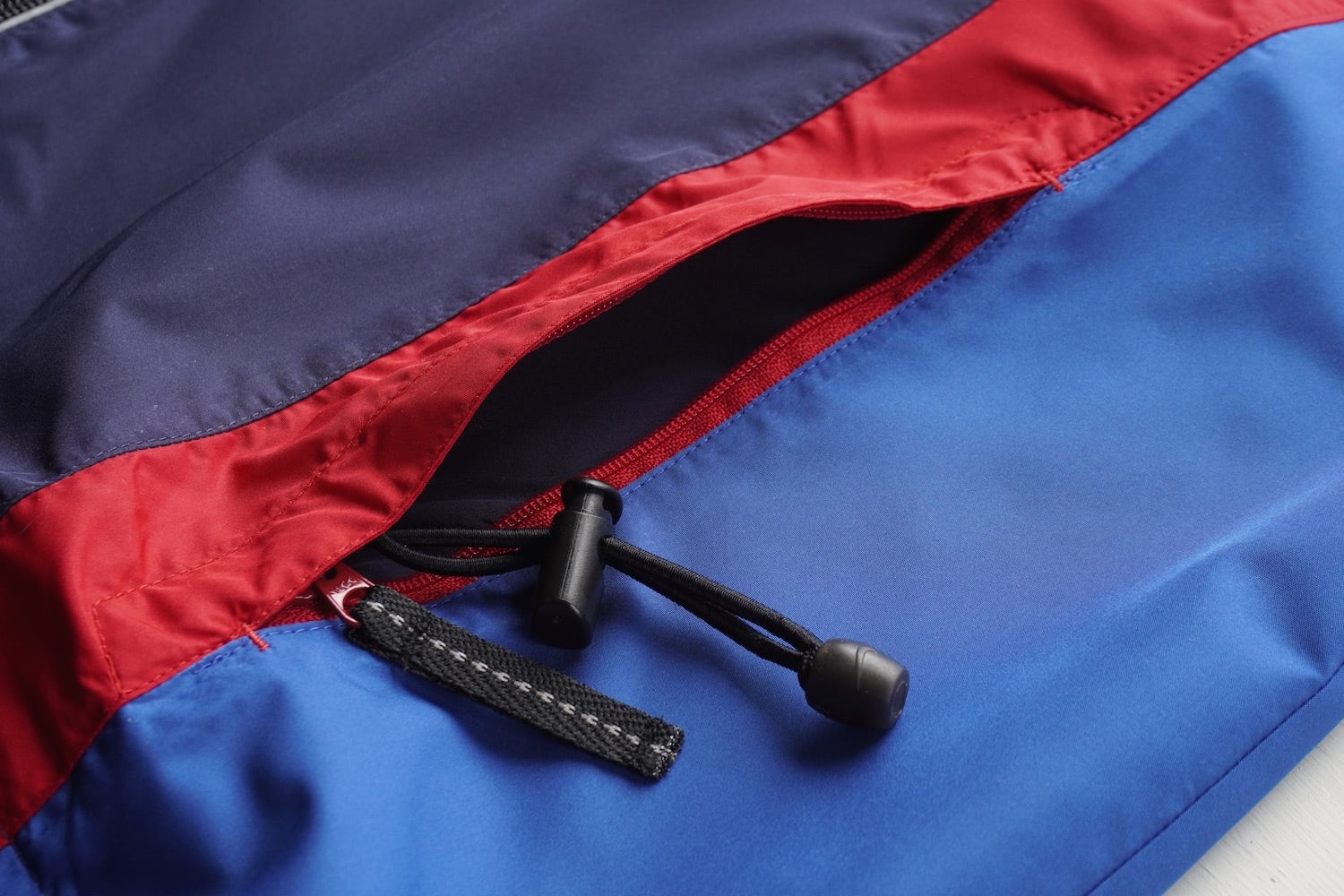 フロントジッパー沿いにリフレクター、ポケット内部には裾に繋がるドローストリング。