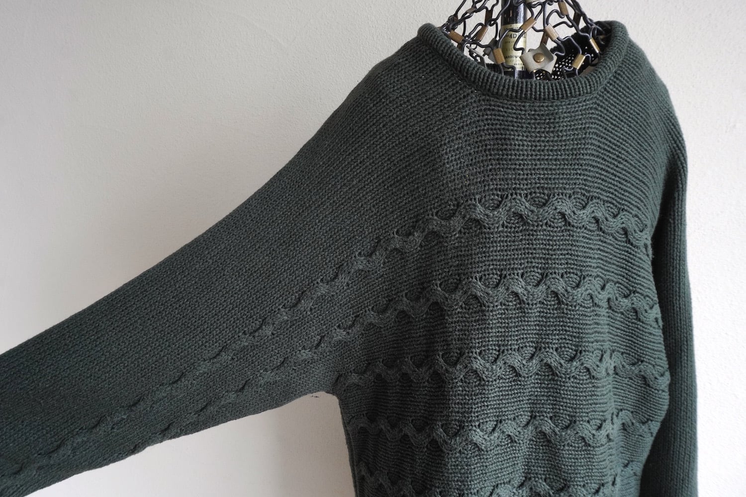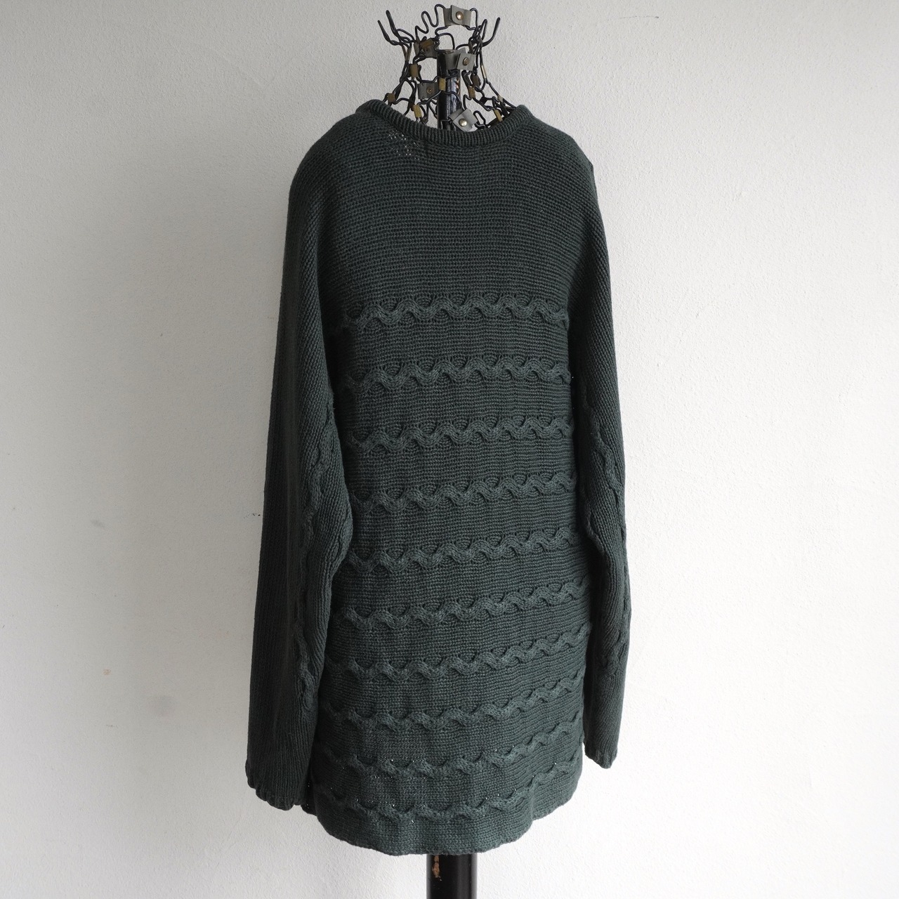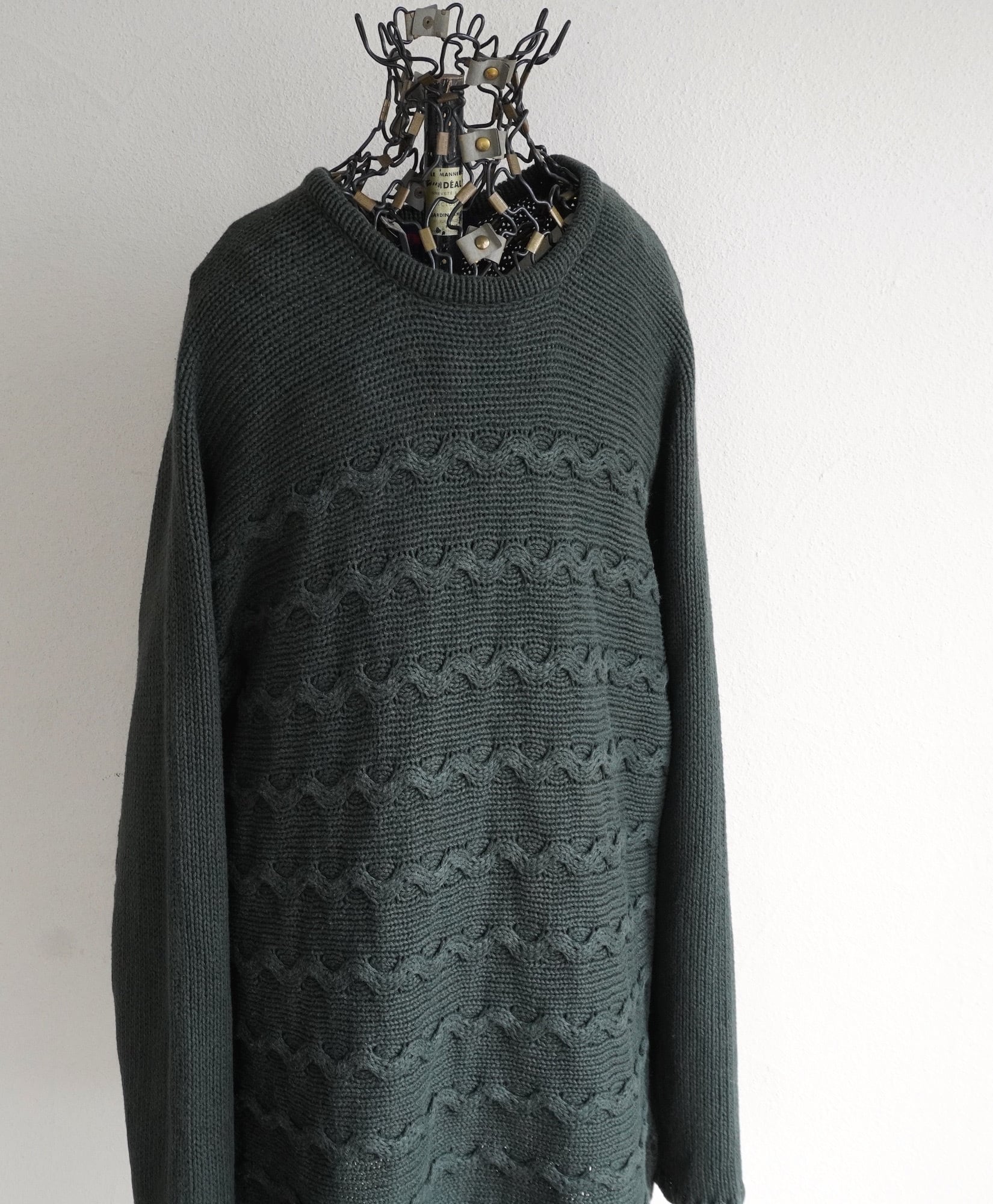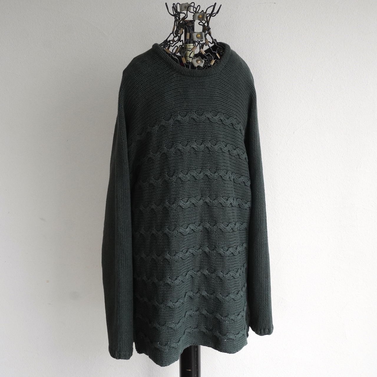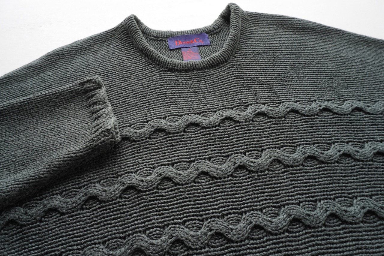 1990's [DENIM & CO.] ラミー×コットン ウェーブパターン ミディアムレングス ニットセーター ダークグリーン 表記(women's M) セミロング ヴィンテージ
