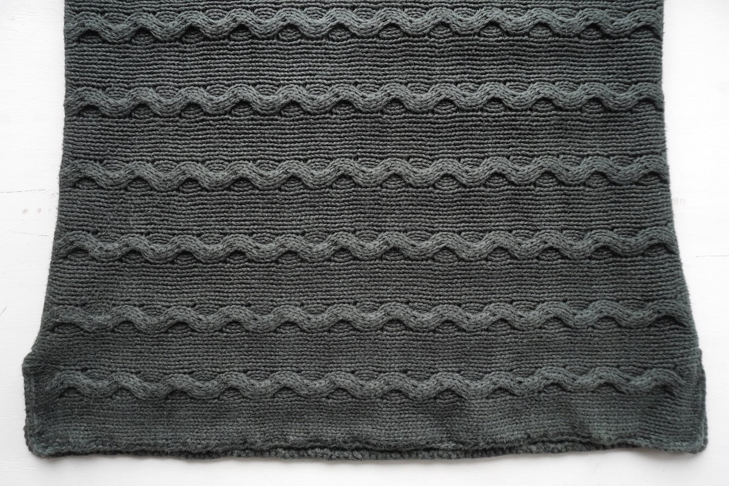 ウェーブパターンの編み模様に、切り替え無くスッキリ繋がったヨークスリーブ。