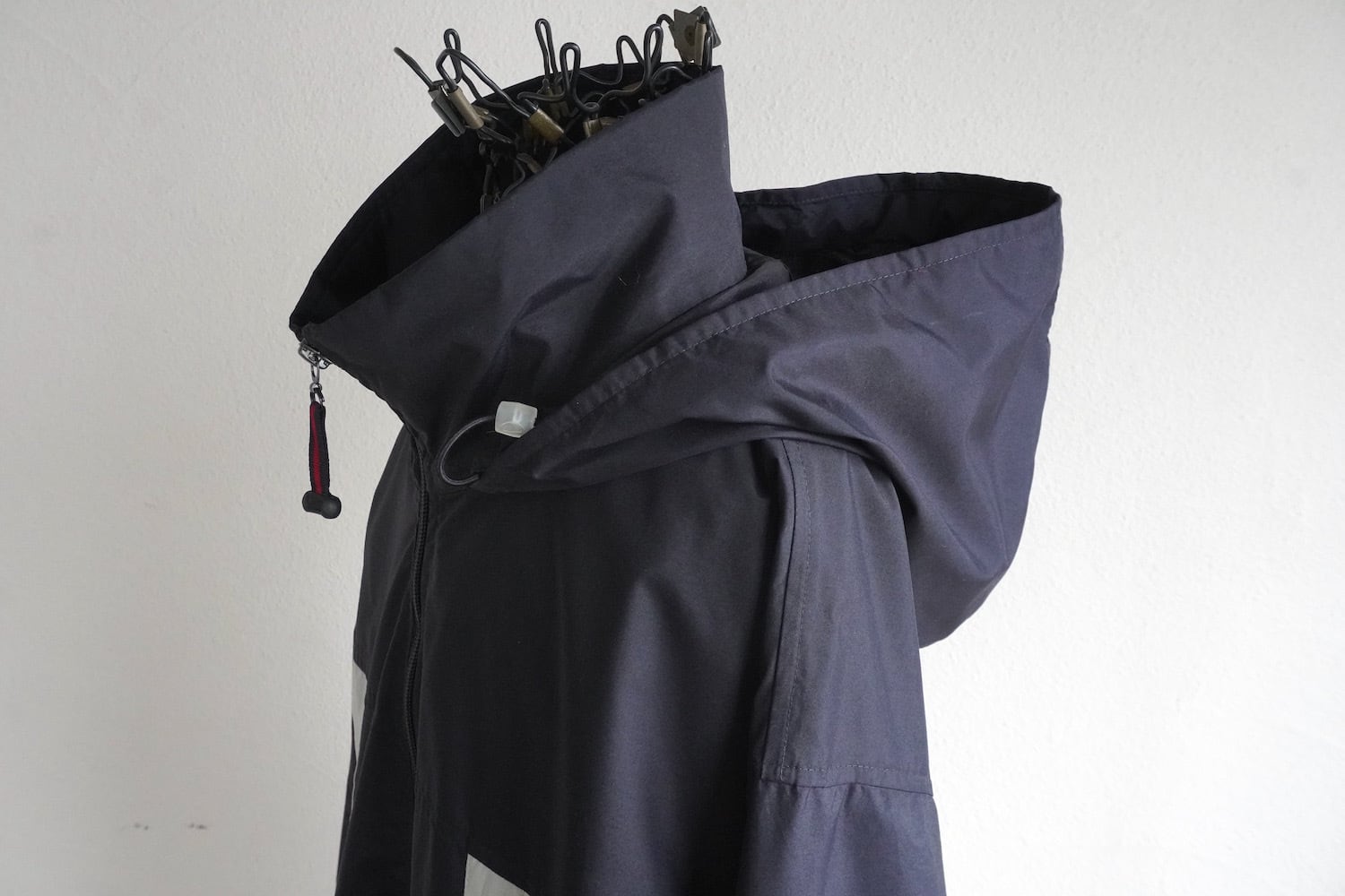マウンテンジャケット型のデザインで、襟にはフードが収納。