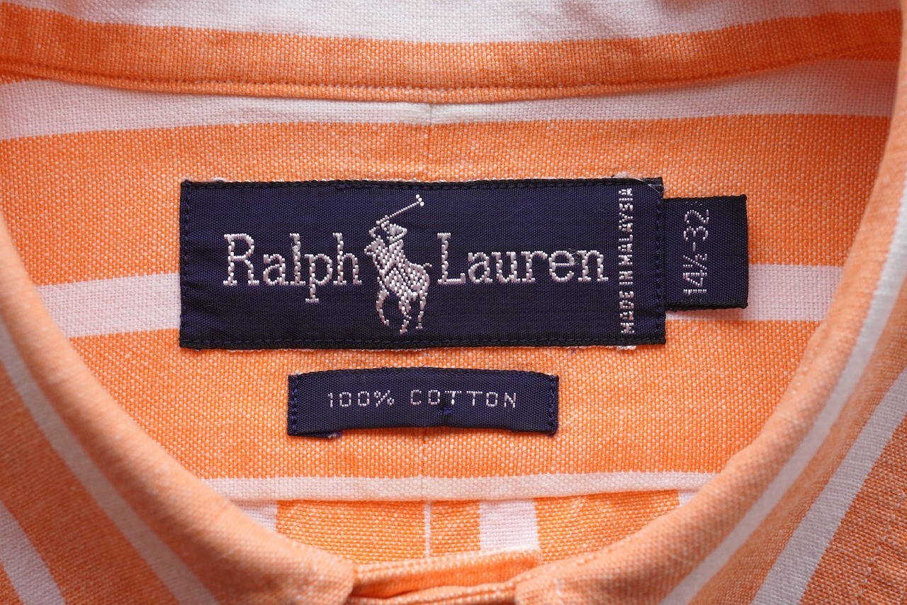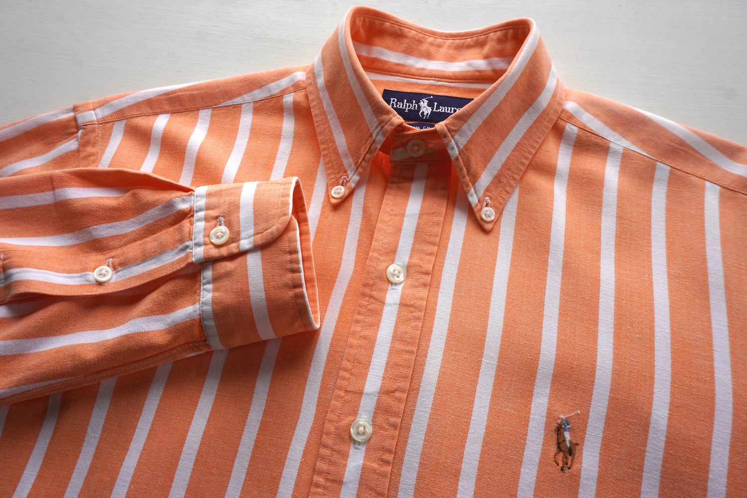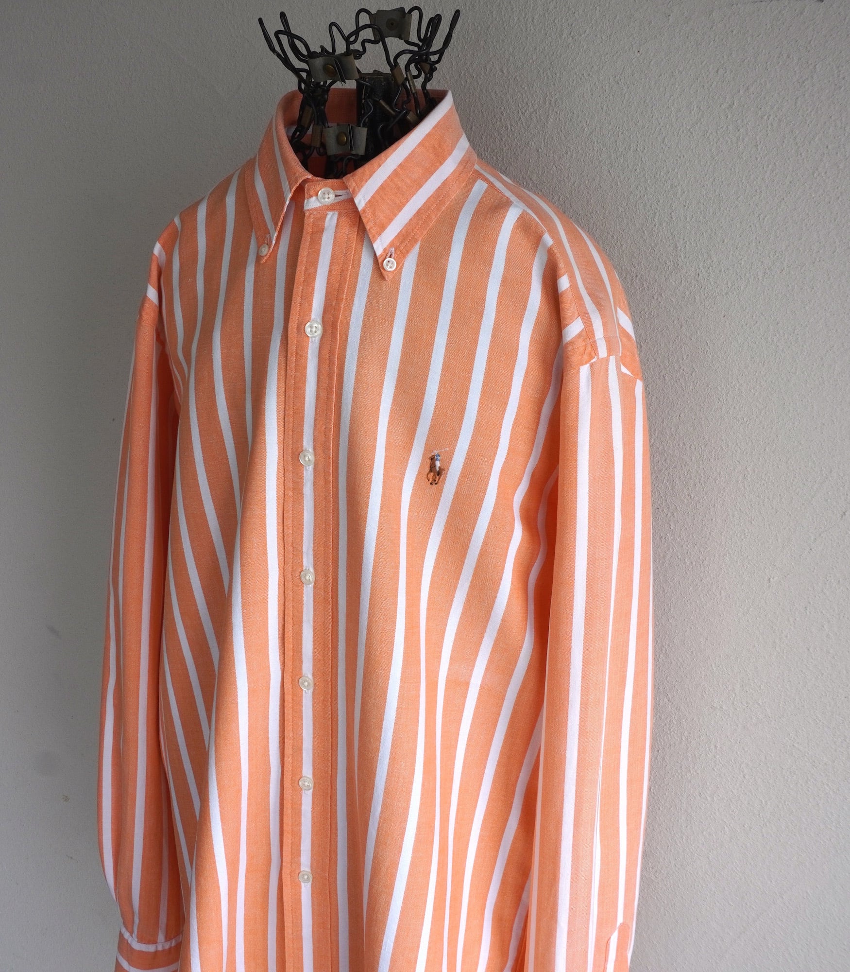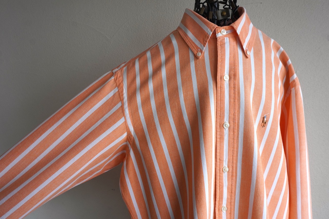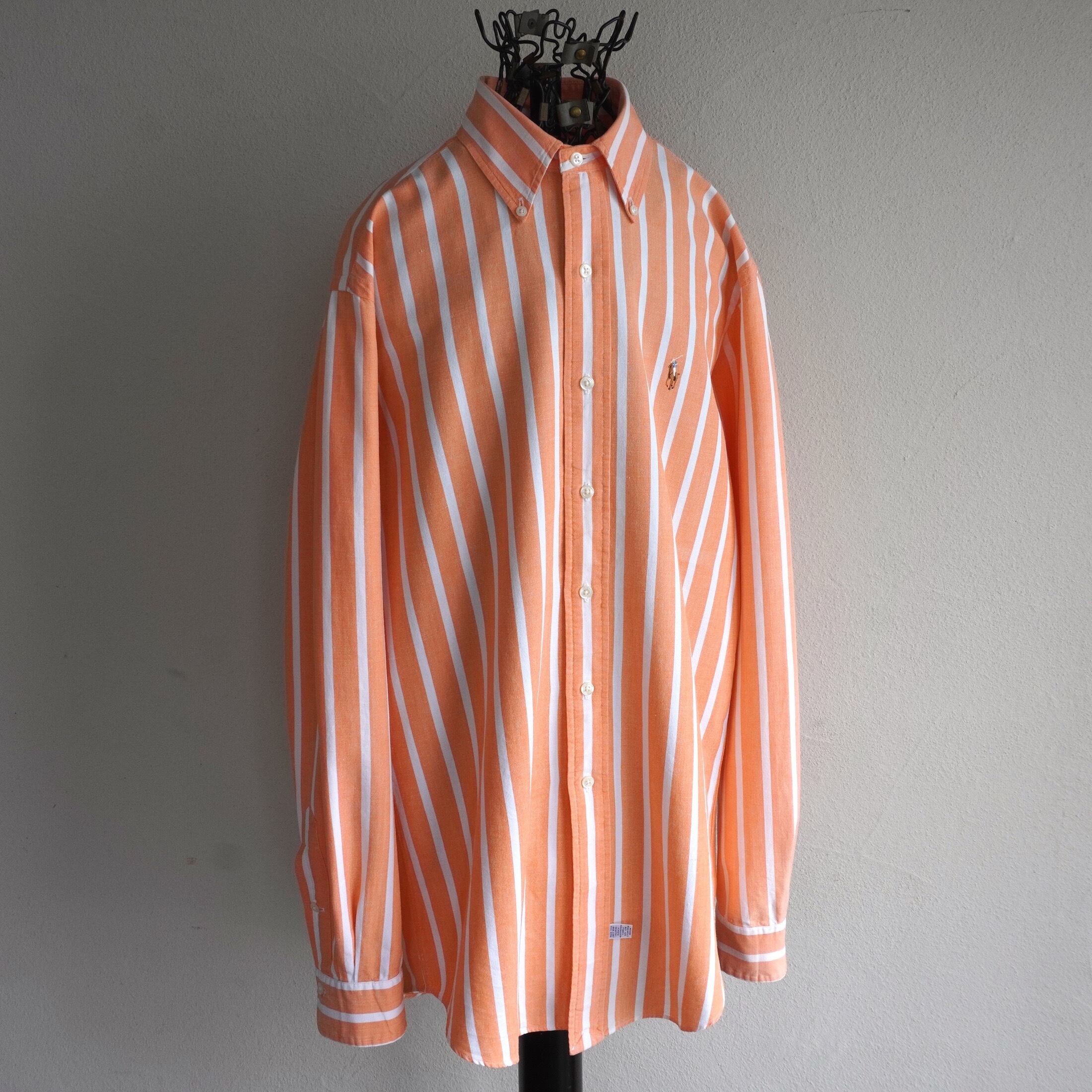 1990's [Ralph Lauren] ストライプ柄 カラード(多色使い)ポニー刺繍 L/S ボタンダウン オックスフォードコットンシャツ アプリコット 実寸(men's S程度) ラルフローレン オールド ヴィンテージ