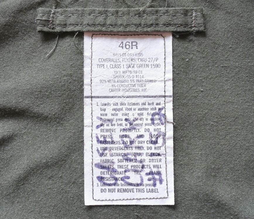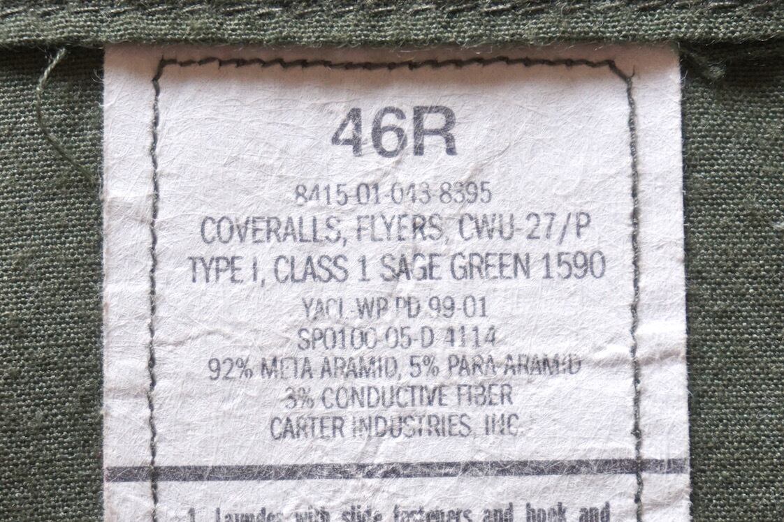 難燃性耐熱繊維「アラミド」素材のU.S.AIR FORCEフライヤーズカバーオール「CWU 27/P」。