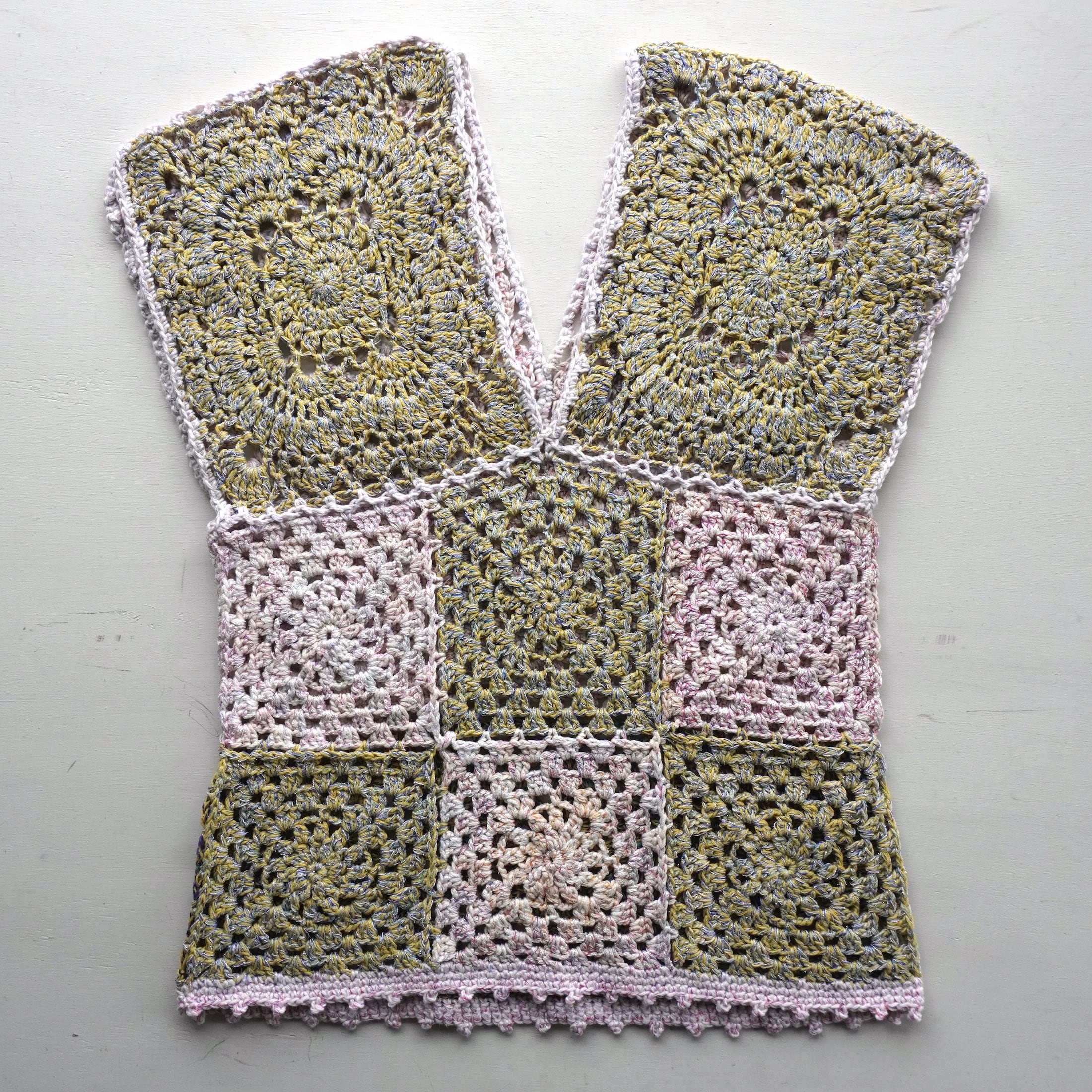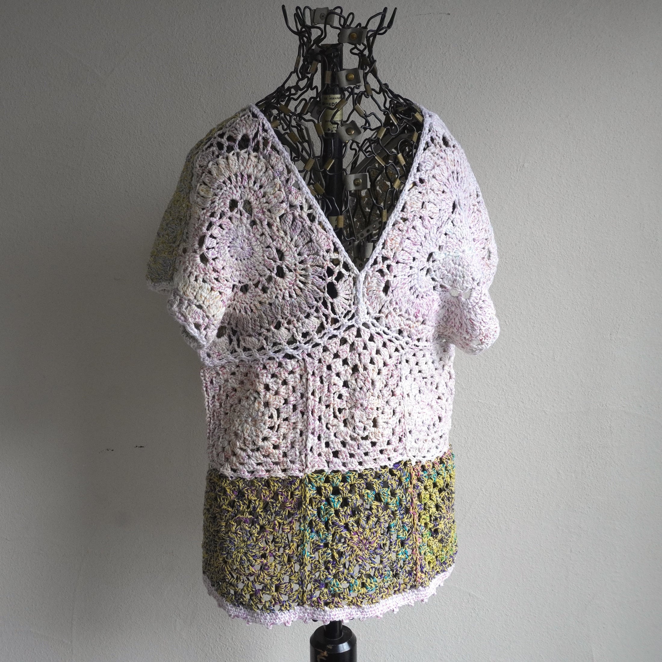 淡いパウダーピンクが可愛いグラニースクエアデザインの、クロシェニットトップ。