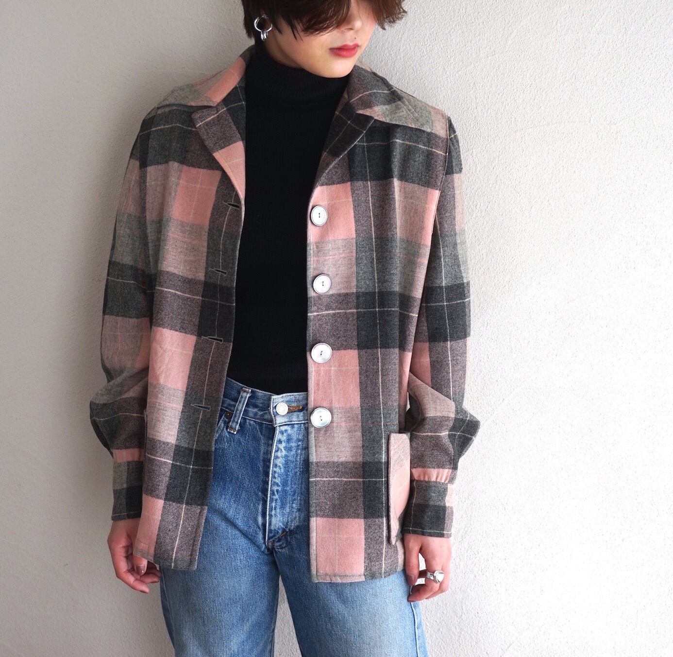 ピンク×グレーの可愛いチェック柄のウールジャケット。
