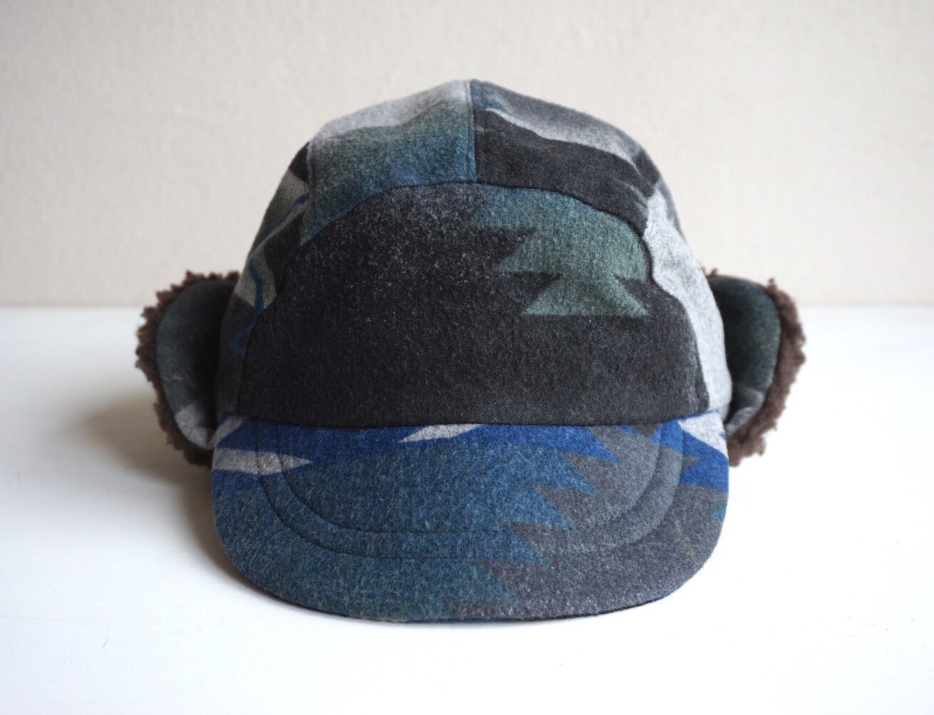 カラーリングの良い90’sのネイティヴ柄フランネルを再構築したアヴィエイターキャップ。