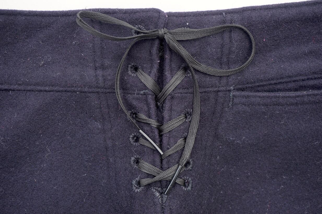 アンカーボタンフラップフロント&バックレースアップのウールセーラーパンツ。