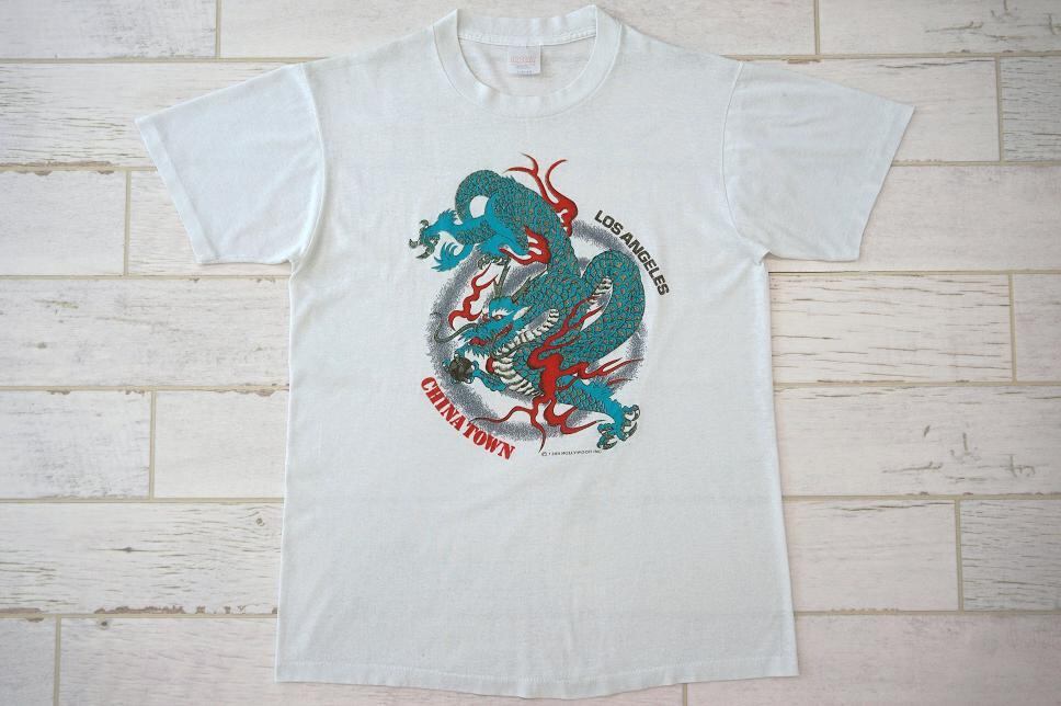 1980’s CHINATOWN LOSANGELES ドラゴンTシャツ 白×金ラメ 表記(L) チャイナタウン ロサンゼルス