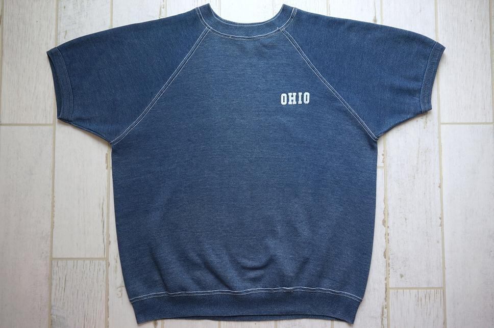 1980’s OHIO フロッキープリントラグラン半袖スウェット 紺×白 実寸(M位)