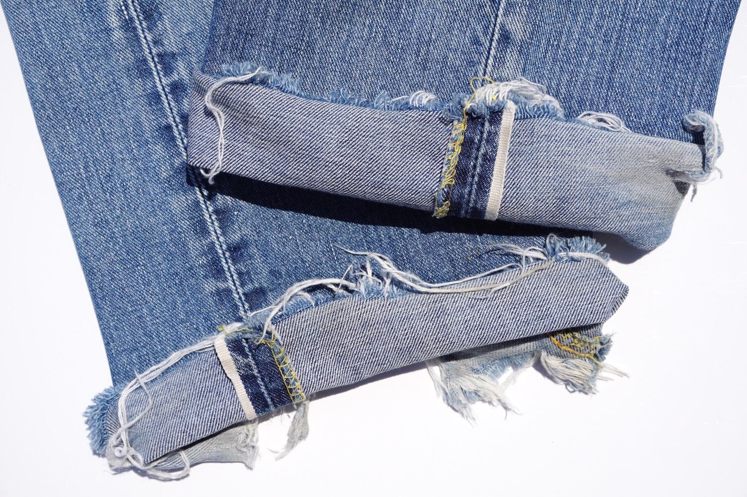 味のある膝ダメージなどはそのままに、ポケット縁など必要箇所のリペア、ヒップなどの生地薄れも補強リペア済み。
