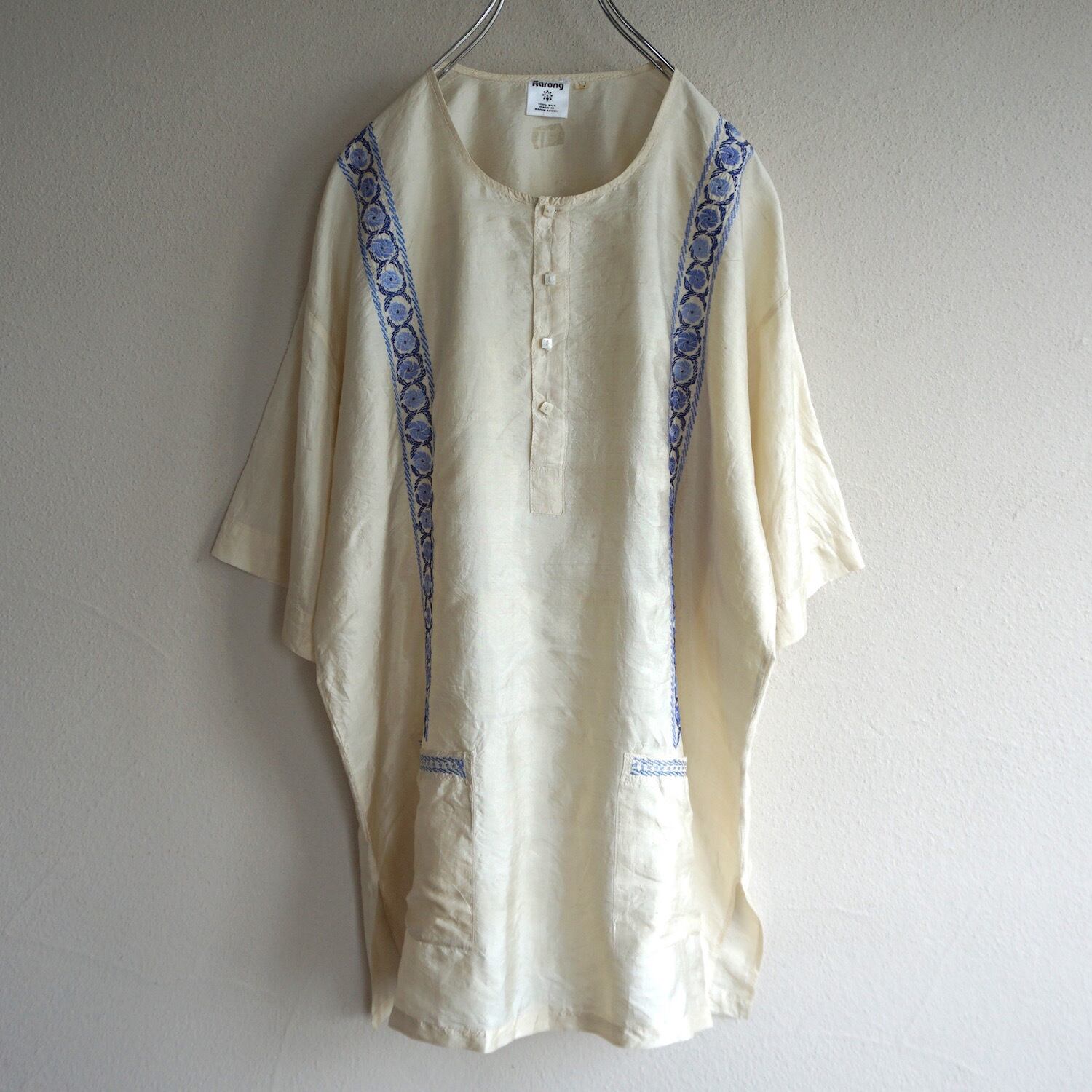 1970’s [Aarong] 刺繍&シェルボタン シルクチュニック アイボリー×ブルー 表記(40)