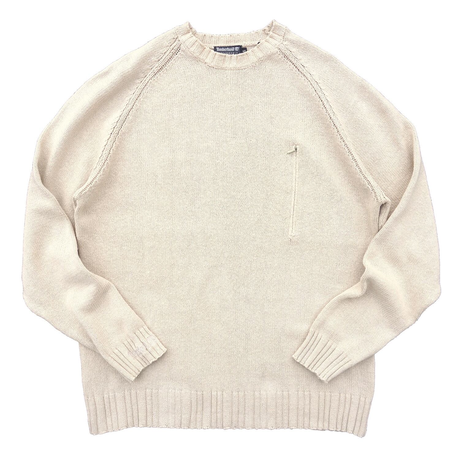 1990’s [Timberland] クルーネック&ラグランスリーブ コットンニットセーター 胸ジップポケット アイボリー 表記(S) ティンバーランド