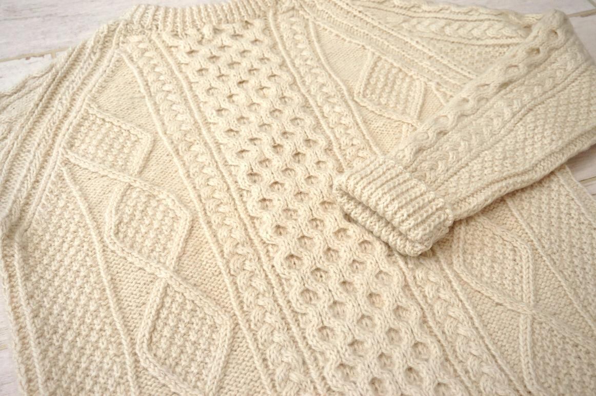 ケーブル、ダイヤモンド、ハニカム、バスケットなどの伝統的な編模様が施されています。