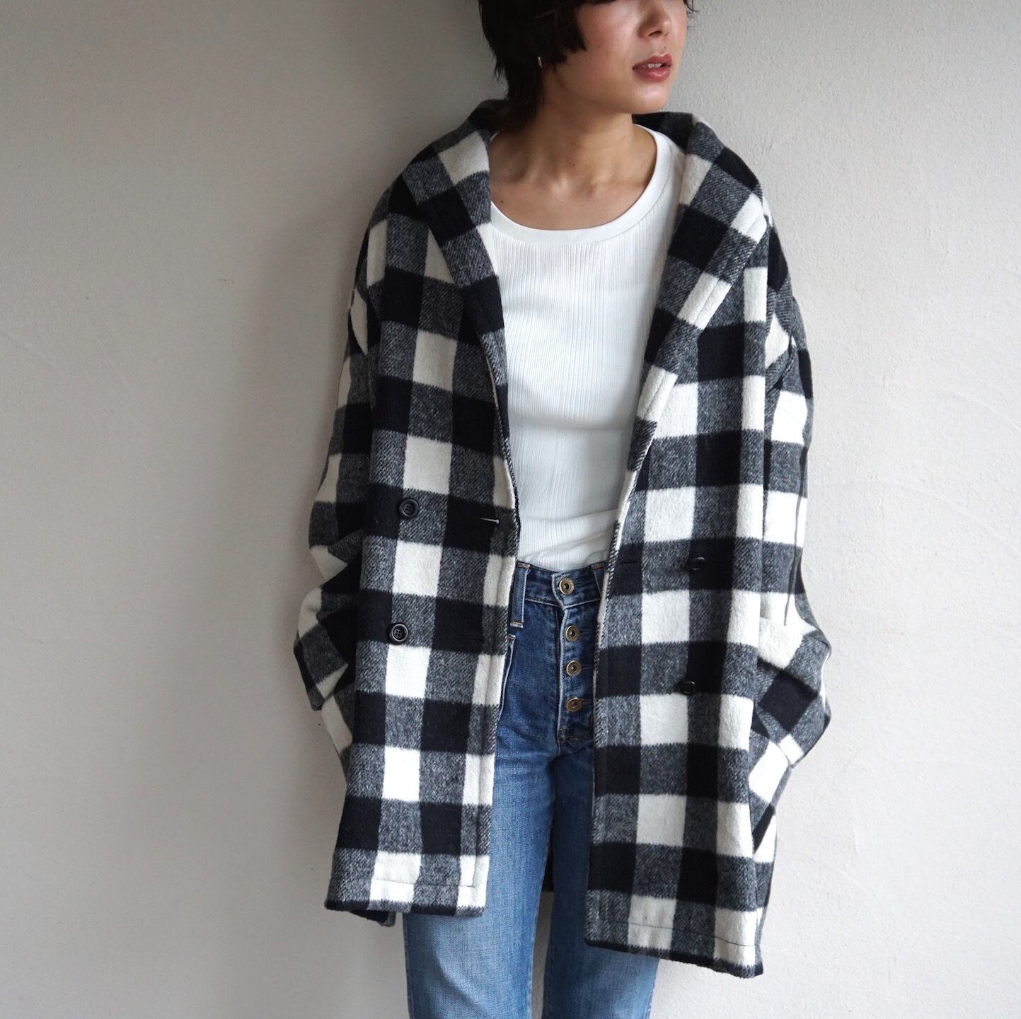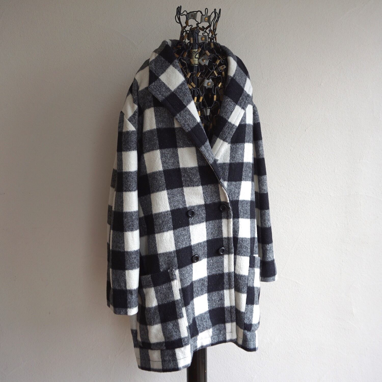 1970’s ITALY製 [CONFEZIONI] ダブルブレスト ウールコート バッファローチェック ホワイト×ブラック 表記(54) ヴィンテージ