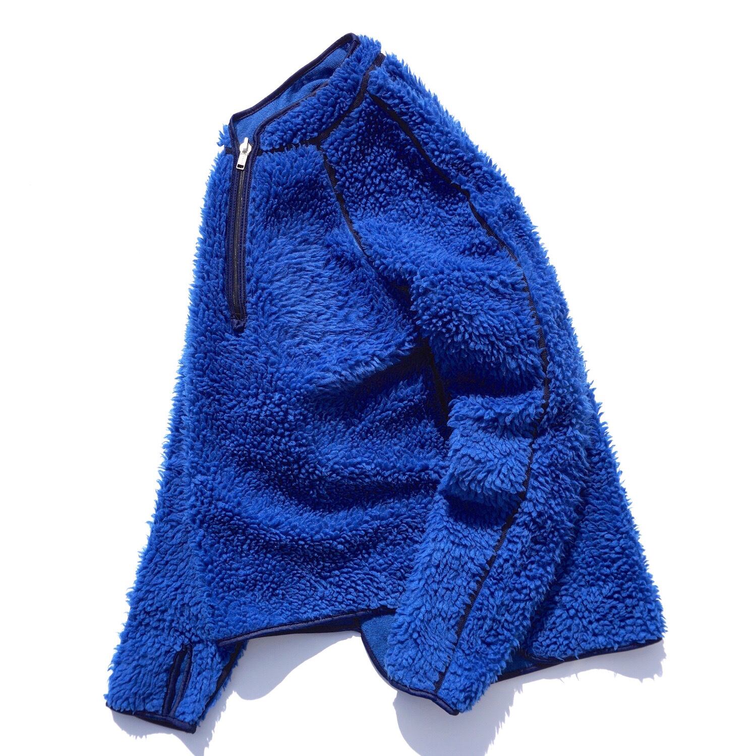 ブルーが鮮やかな、毛足の長いハイパイルのフリースプルオーバー。