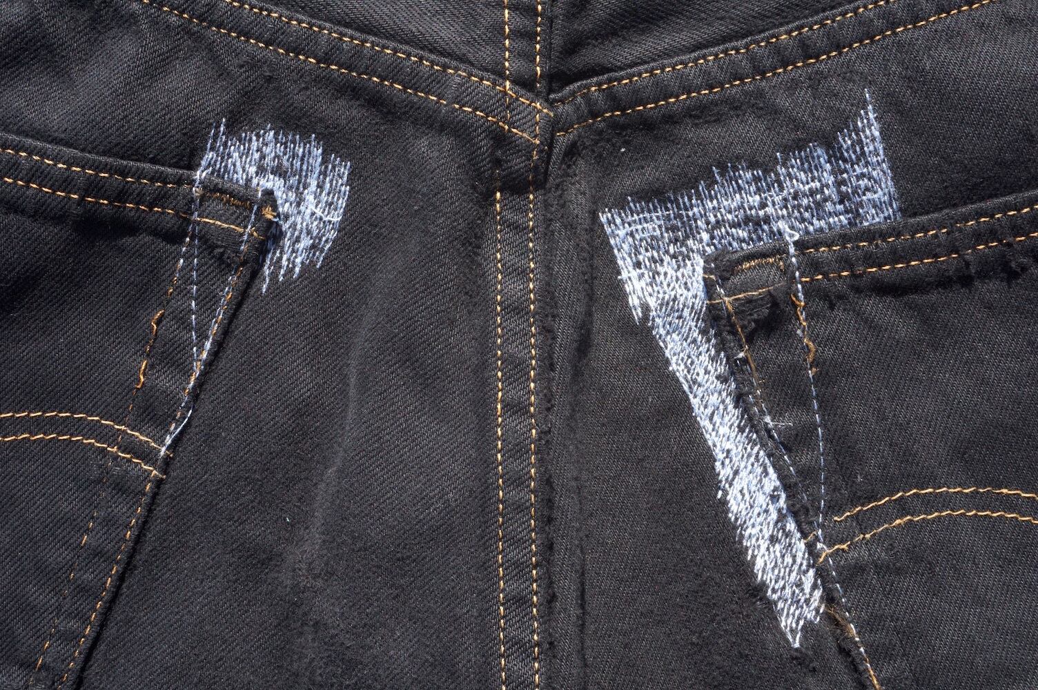とても凝ったパッチワーク&リペアが施された、501オーバーダイ(後染め)ブラックジーンズ。