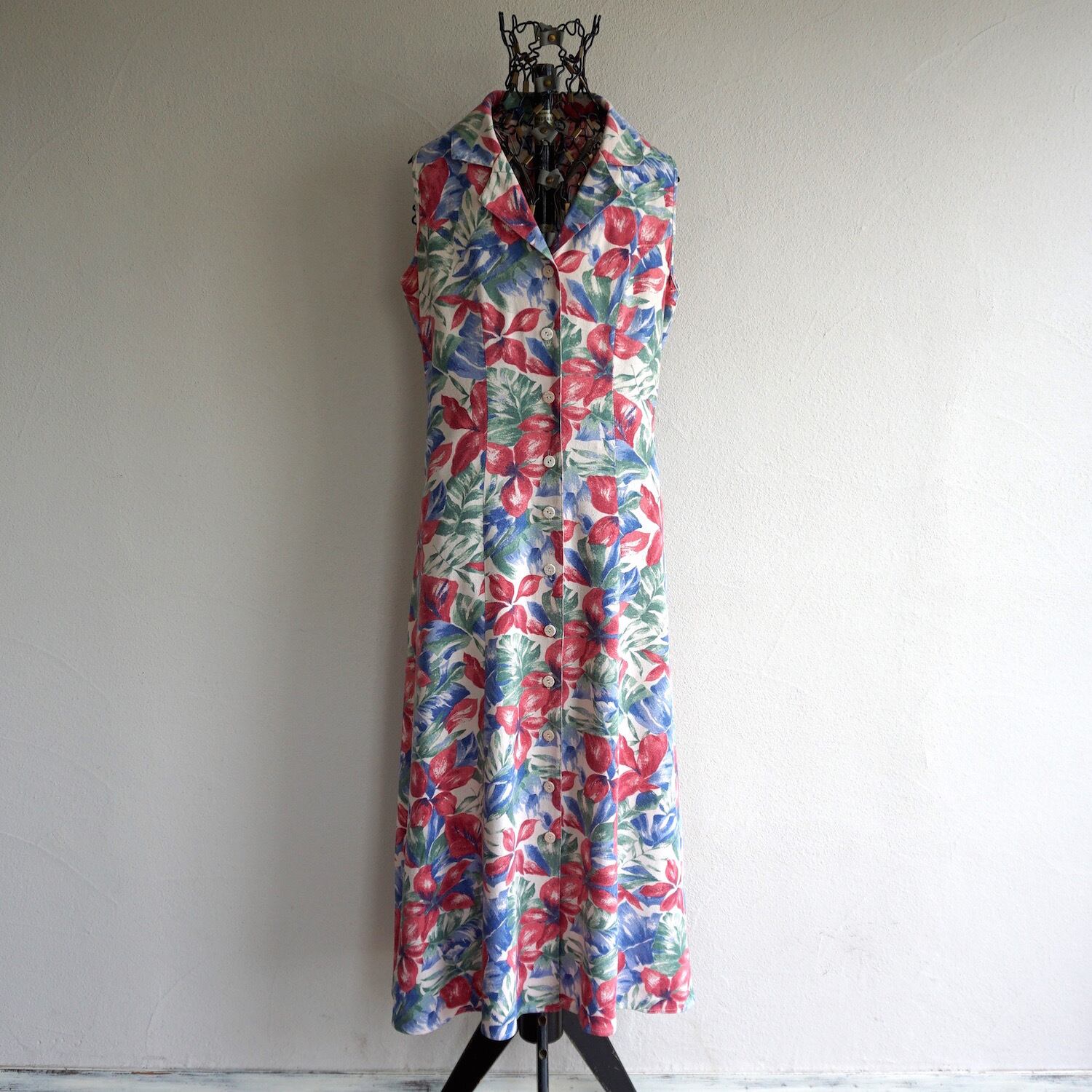 水彩画の様な鮮やかなフローラル&ボタニカルパターンの、スリーブレスロングドレス。