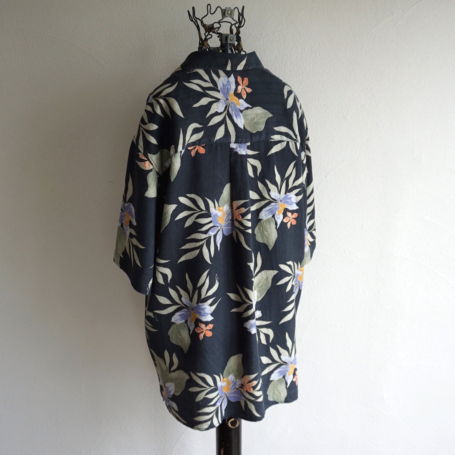配色の良いブラック基調ボタニカルパターンのS/Sシルクシャツ。