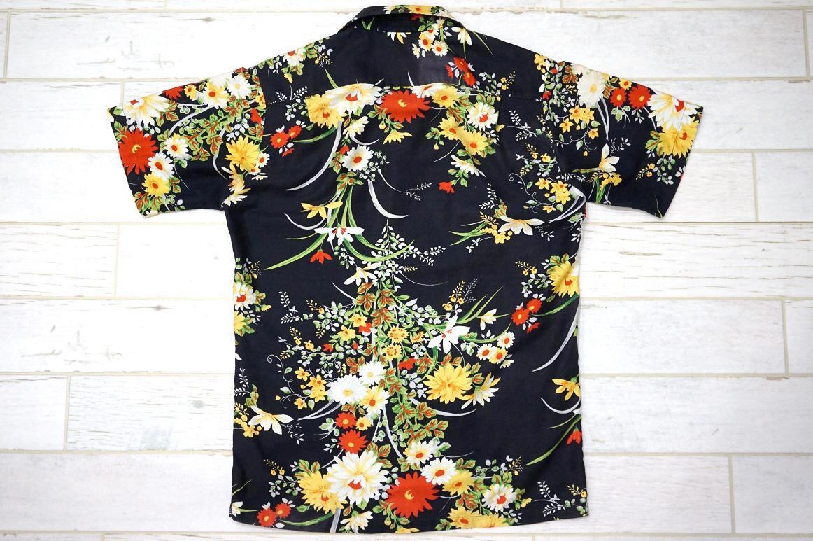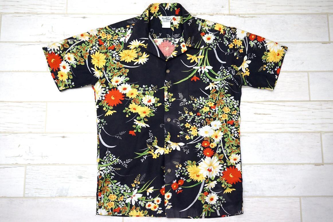 1970’s Paradise Hawaii ハワイアンシャツ 金ボタン 花柄 ブラック 表記(L) アロハ