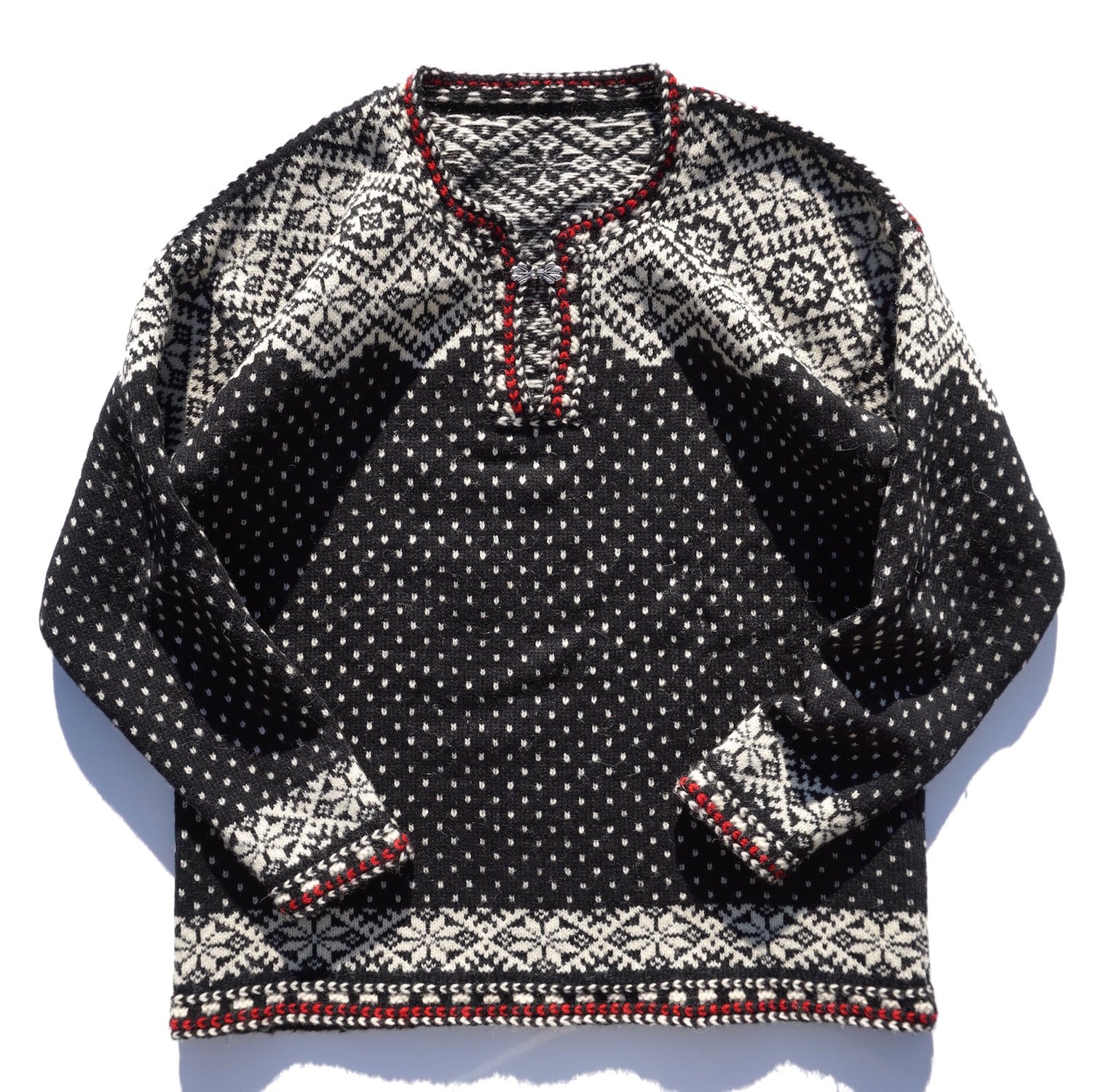 1970’s〜 ノルディックセーター 1フック プルオーバー ブラック×ホワイト×レッド 実寸(M程度) 雪柄 バーズアイ チロリアン ヴィンテージ