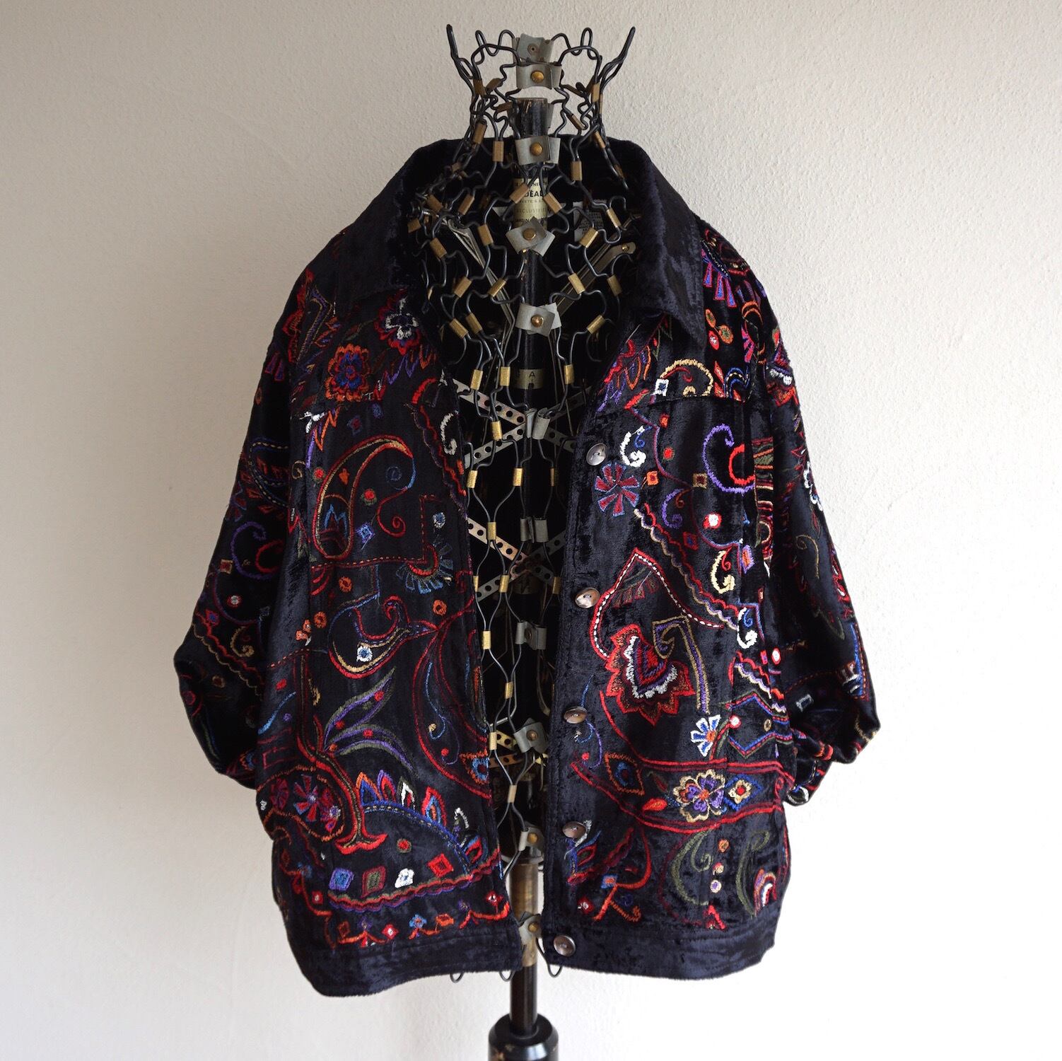 ペイズリー調の総刺繍が施された、ヴェルヴェットトラッカー(ジージャン型)ジャケット。