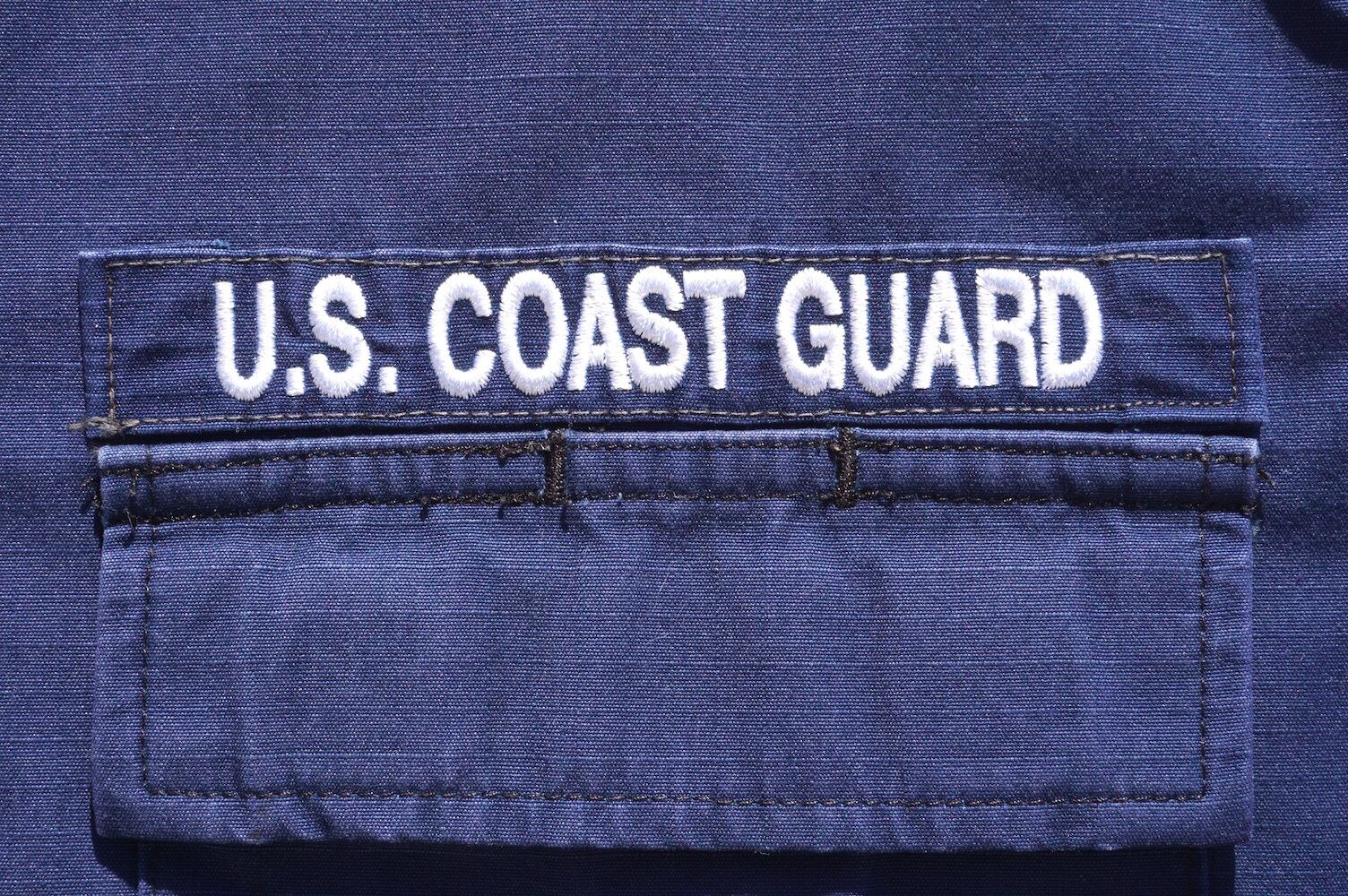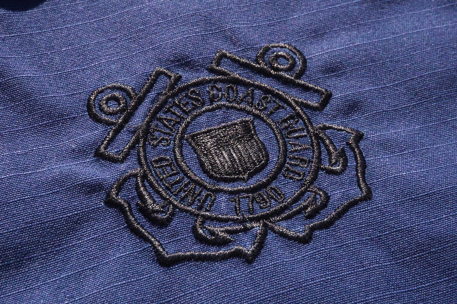 右胸ポケットにUSCGマーク刺繍、左胸にU.S.COAST GUARDパッチ。