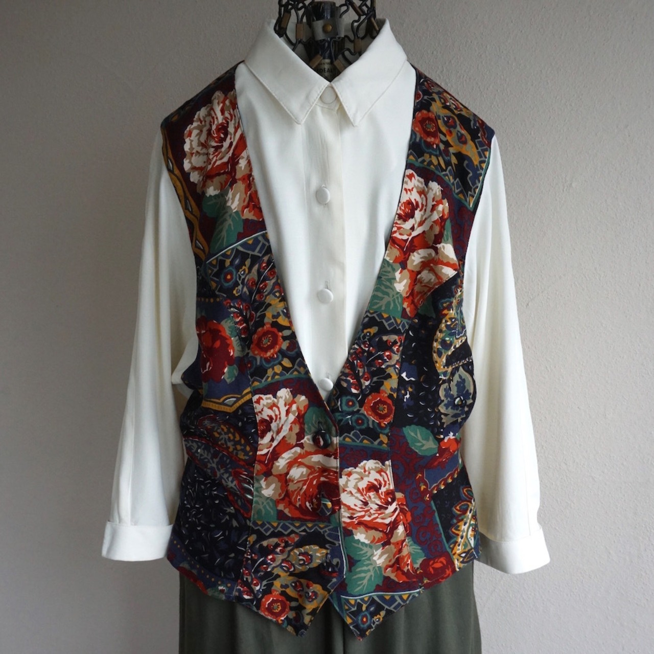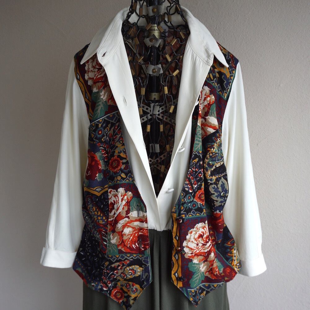 白ブラウス×花柄ベスト×オリーブスカート