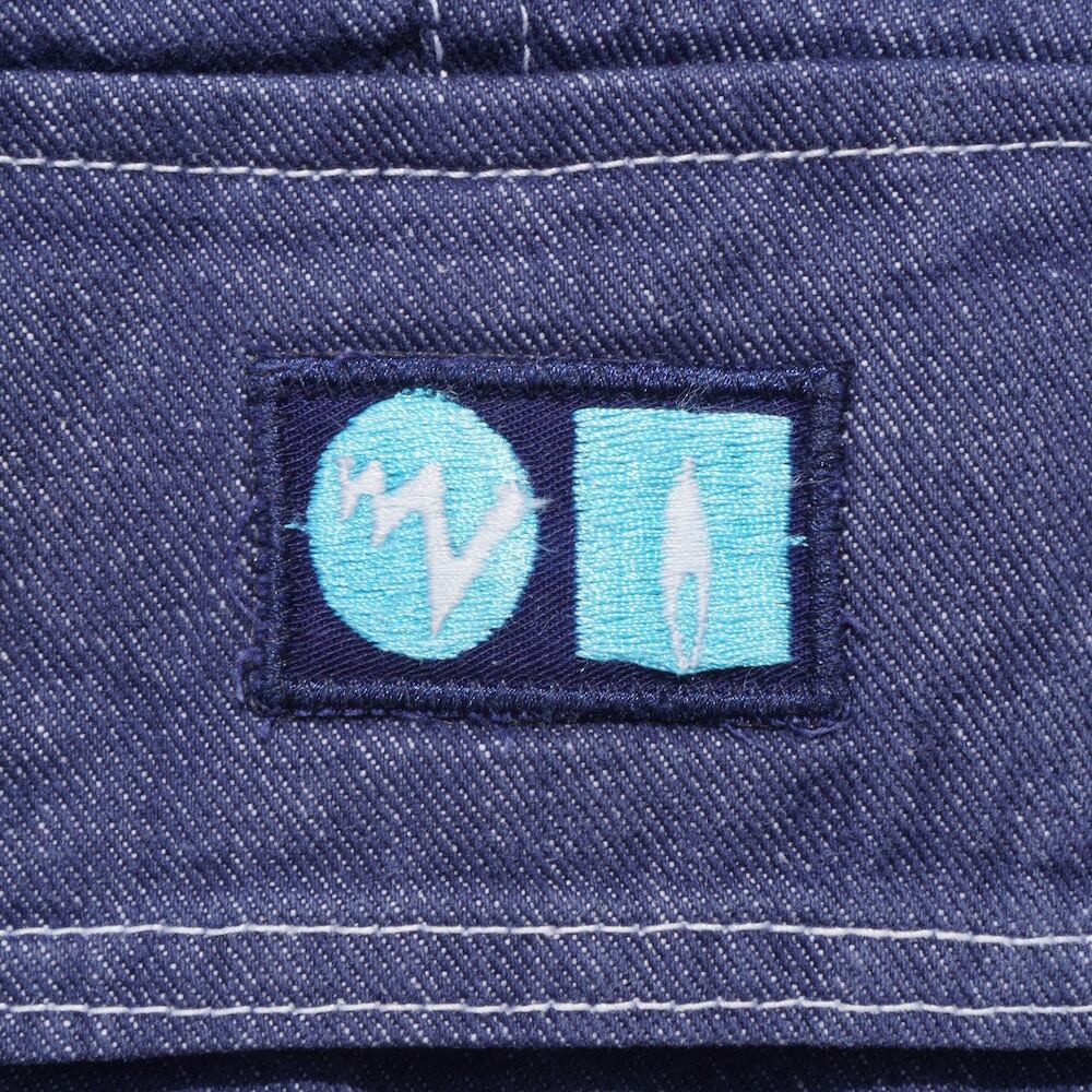 カーゴポケットフラップの企業ロゴ刺繍が良いアクセント。