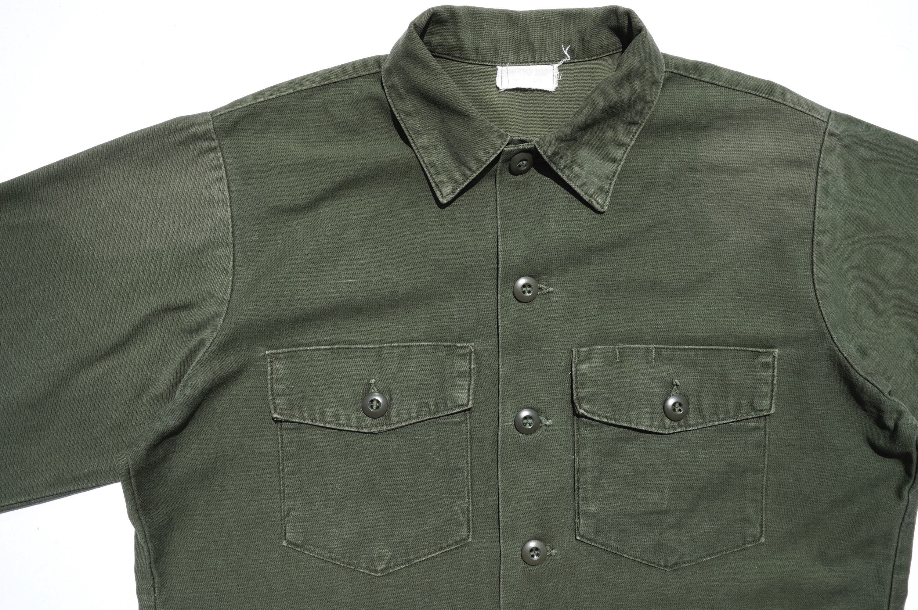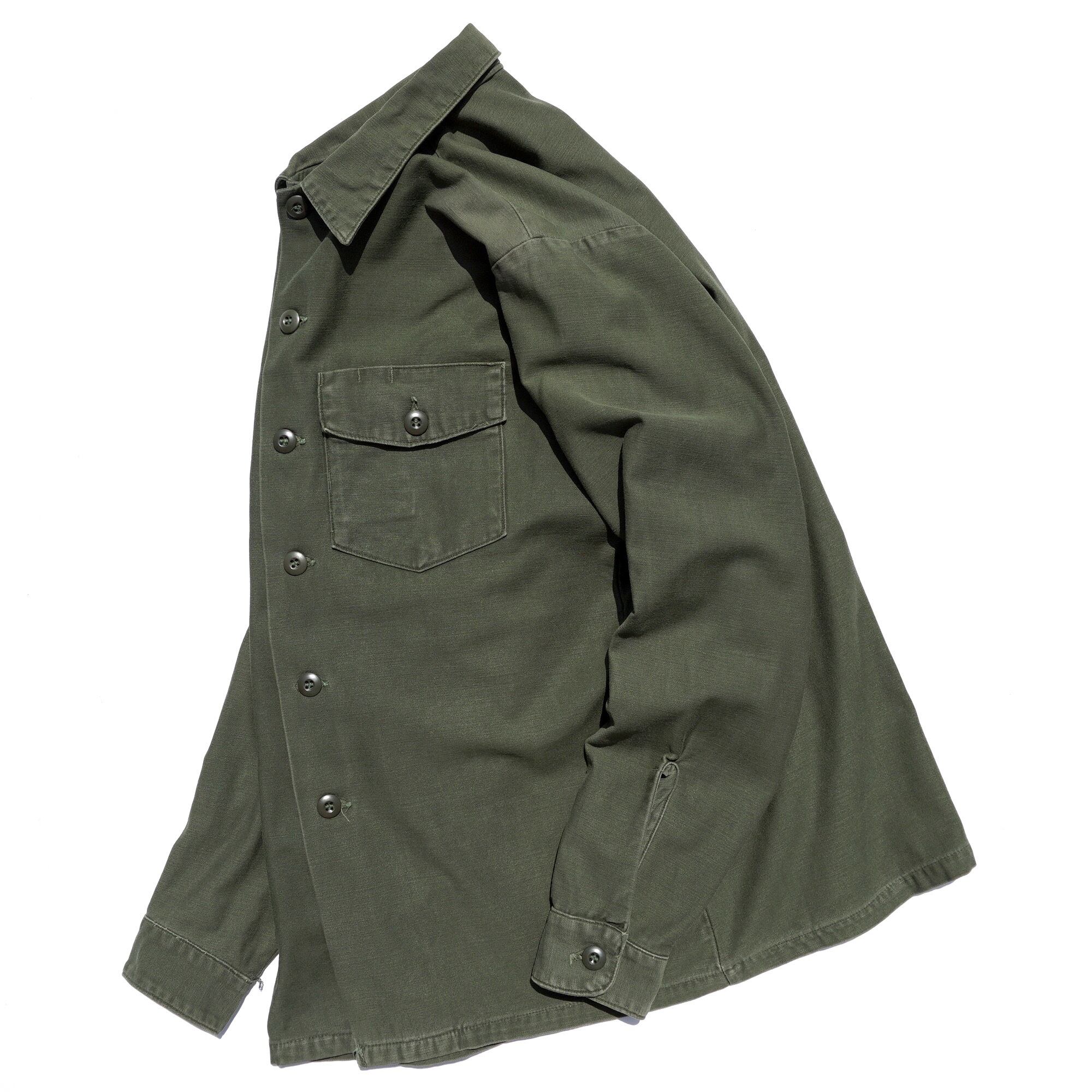 1970’s [U.S.ARMY] コットンサテン ユーティリティシャツ OG-107 プレーン 無地 オリーブ 実寸(L程度) アメリカ軍 実物 ヴィンテージ