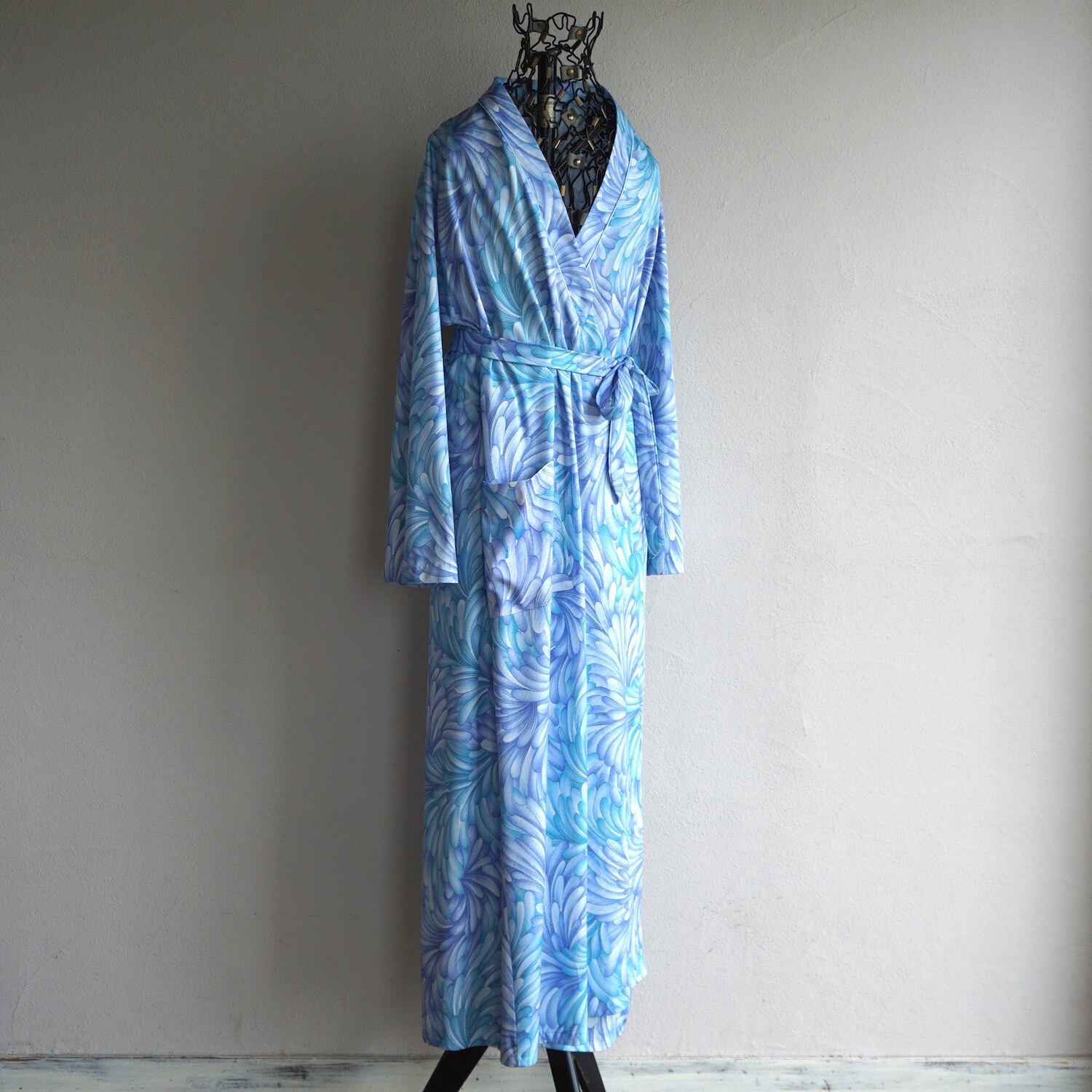 花、波、鳥の羽にも見えるとても綺麗な総柄の、ポリエステルロングガウン。