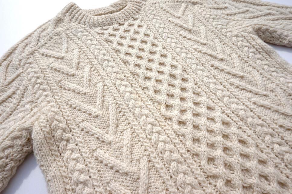 ケーブルやハニカムなどの伝統的な柄で編み込まれたフィッシャーマンセーター。