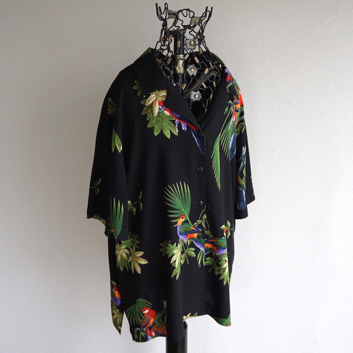 1990’s [Tapestry] オープンカラー&ボックスシルエット S/S リゾートシャツ インコ&ボタニカル柄 ブラック 表記(women's XL) ハワイアン アロハ