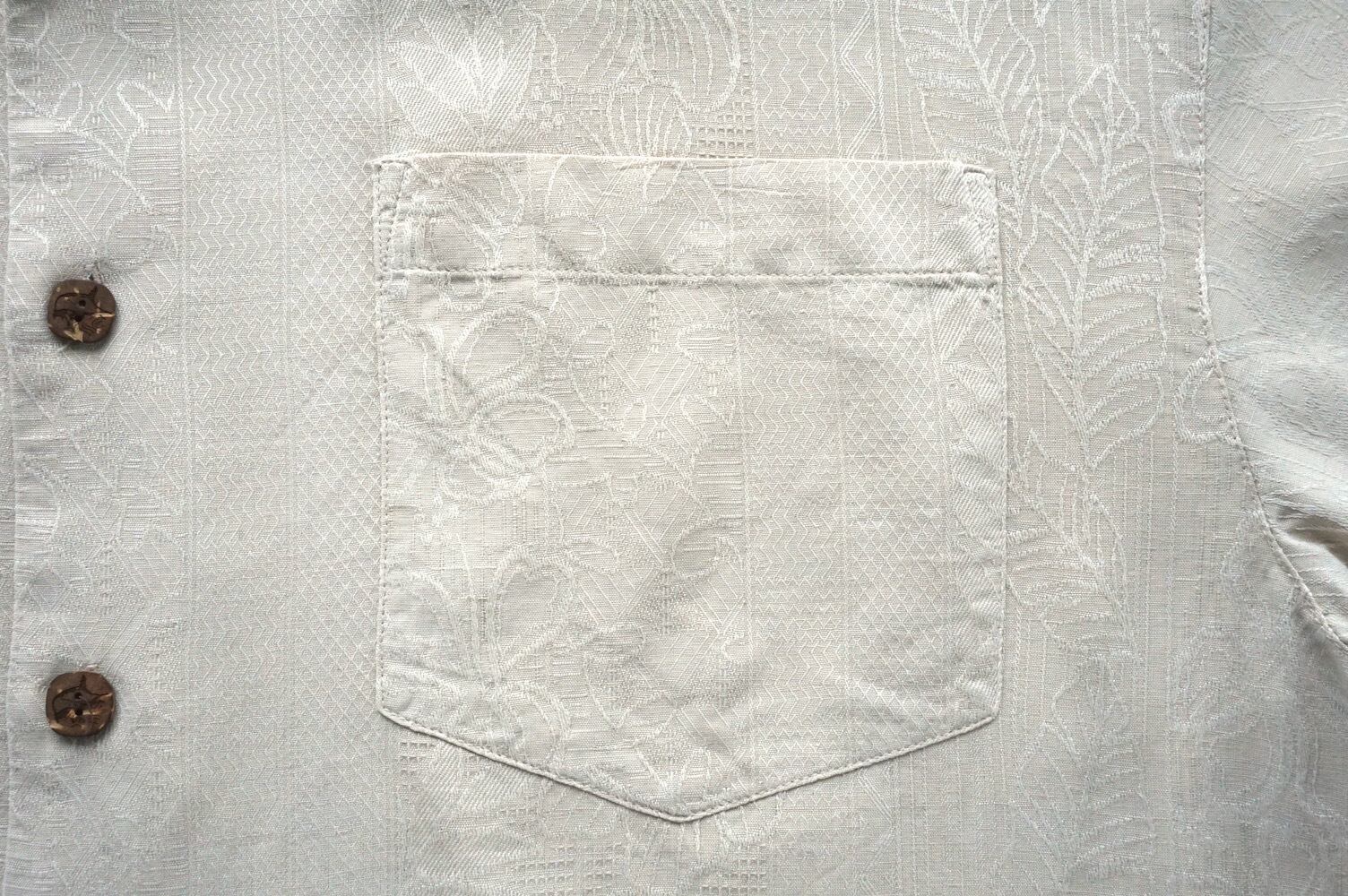 [Bermuda Bay] 100%シルク ハイビスカス&ボタニカル織柄 S/S リゾートシャツ オープンカラー ボックスシルエット ベージュ 表記(L) ハワイアン アロハ