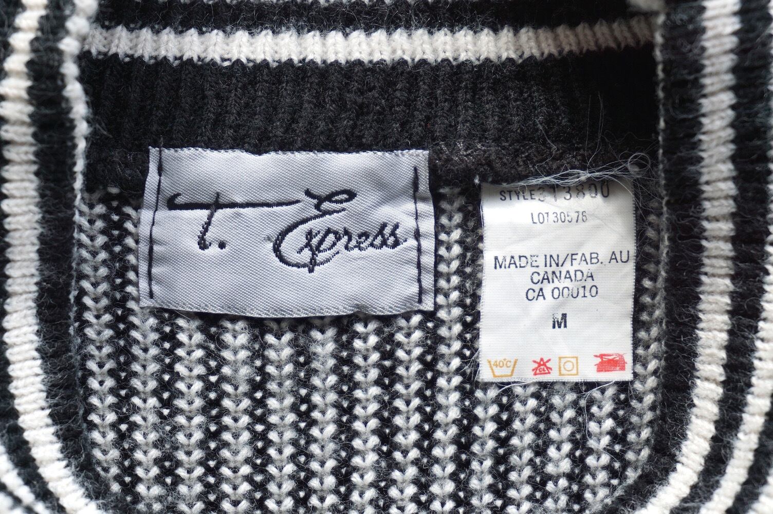 1990’s CANADA製 [T.Express] モノトーンストライプ柄 モックネック アクリルニットセーター ブラック×ホワイト 表記(M) モード ヴィンテージ