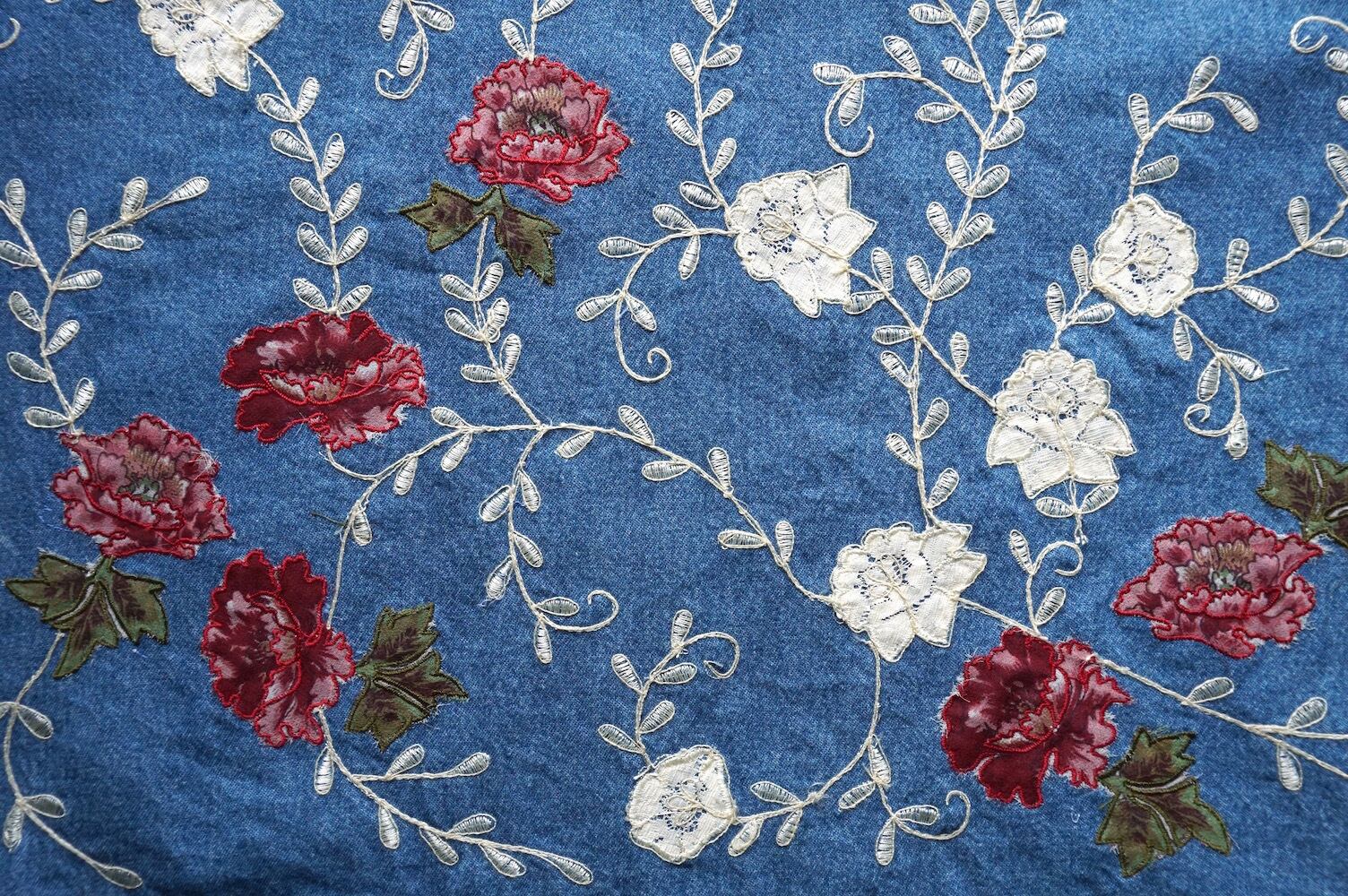 オーガンジー&レースをあしらったフローラル刺繍が全体に施された、華やかなデニムジャケット。