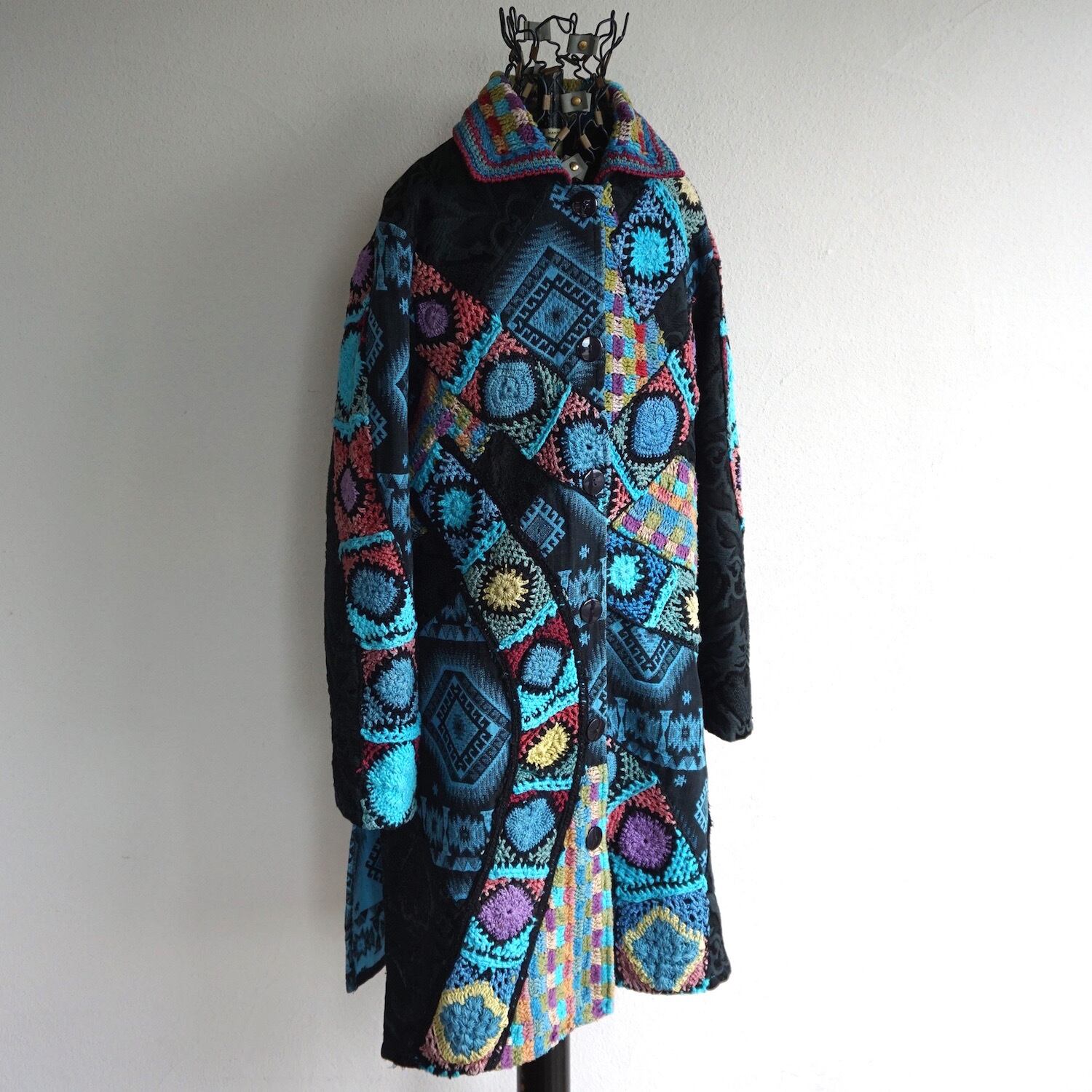 1990’s [SANDY STARKMAN] ダマスク柄×トライバルラグ柄 モチーフニッティング装飾 ロングコート ブラック 表記(women's S) ヴィンテージ | MAGNOLIA WEBSTORE