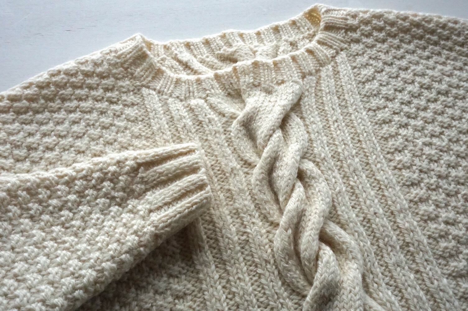 前後中央に編み込まれた太く立体的なケーブル(縄)が印象的な、フィッシャーマンセーター。
