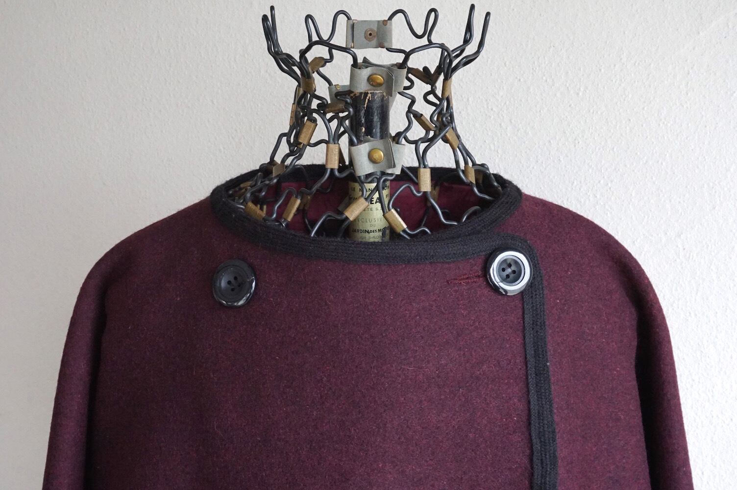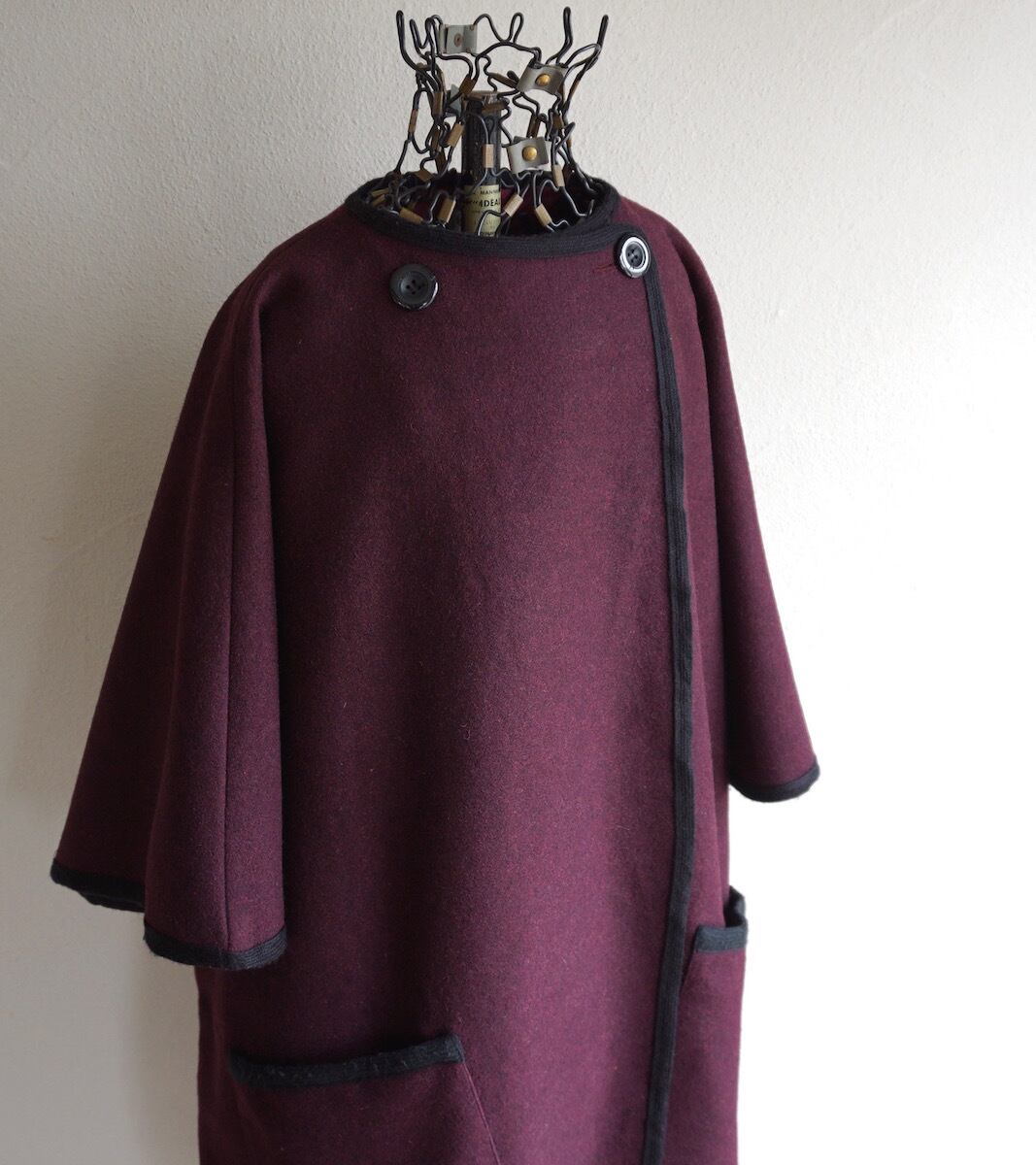 1980’s ENGLAND製 [Polly Peck] クローク風ビッグシルエット カラーレス ウールコート ワイン 実寸(women's Free程度) イギリス UK ヴィンテージ