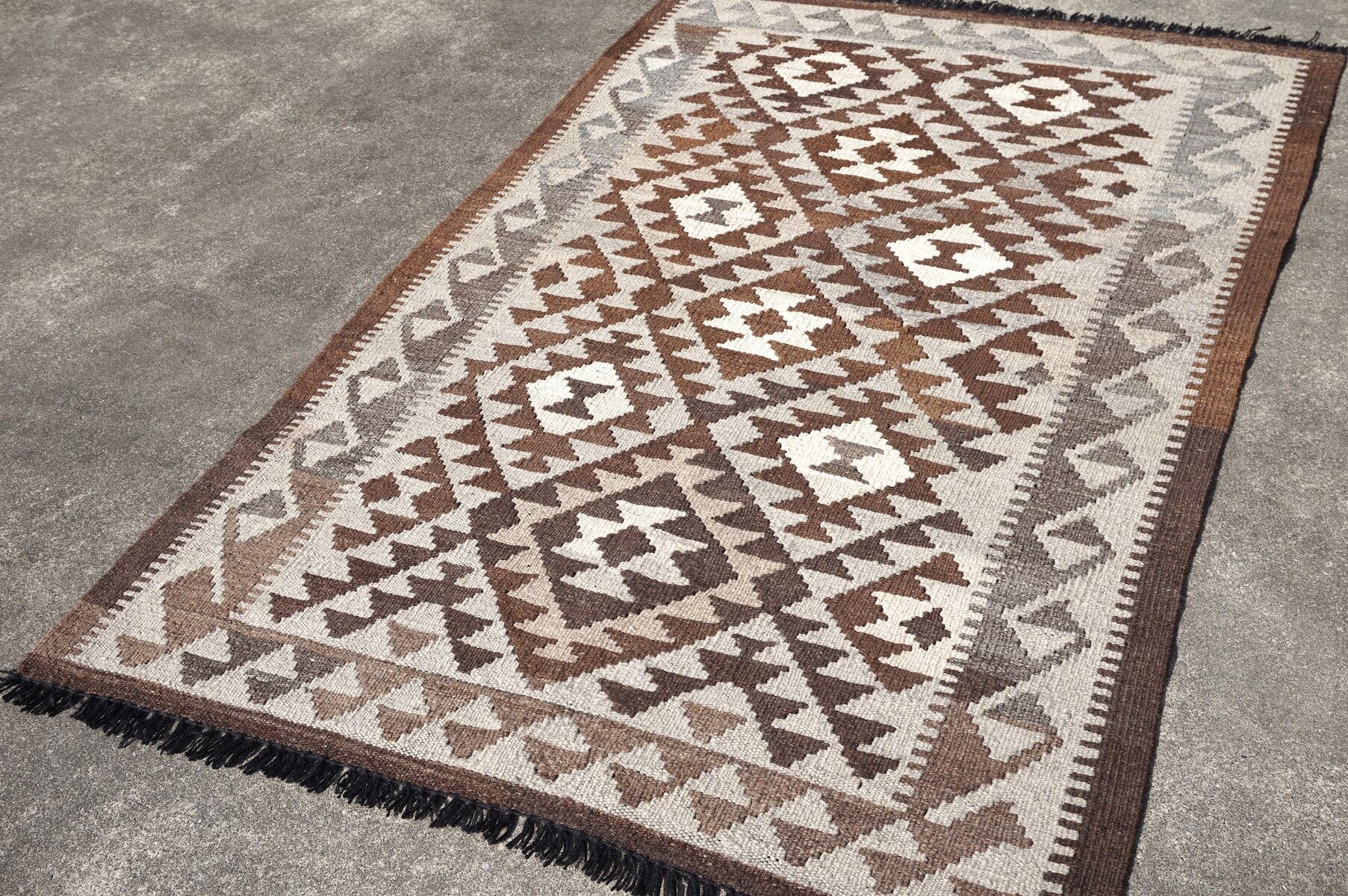 ナチュラルなブラウン系のアースカラーでまとまった、アフガンキリム。