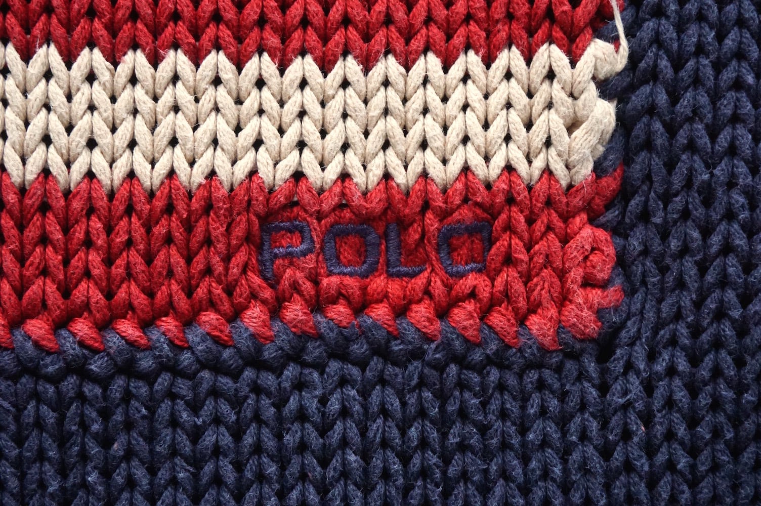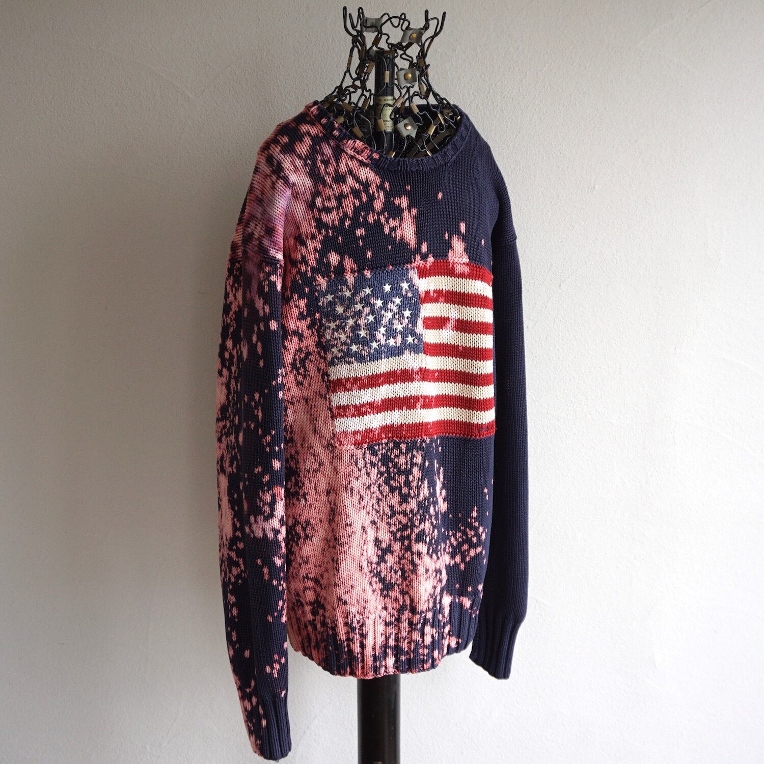 1990’s [Ralph Lauren] ブリーチ 星条旗柄 コットンニットセーター ネイビー 表記(M) USAフラッグ ラルフローレン