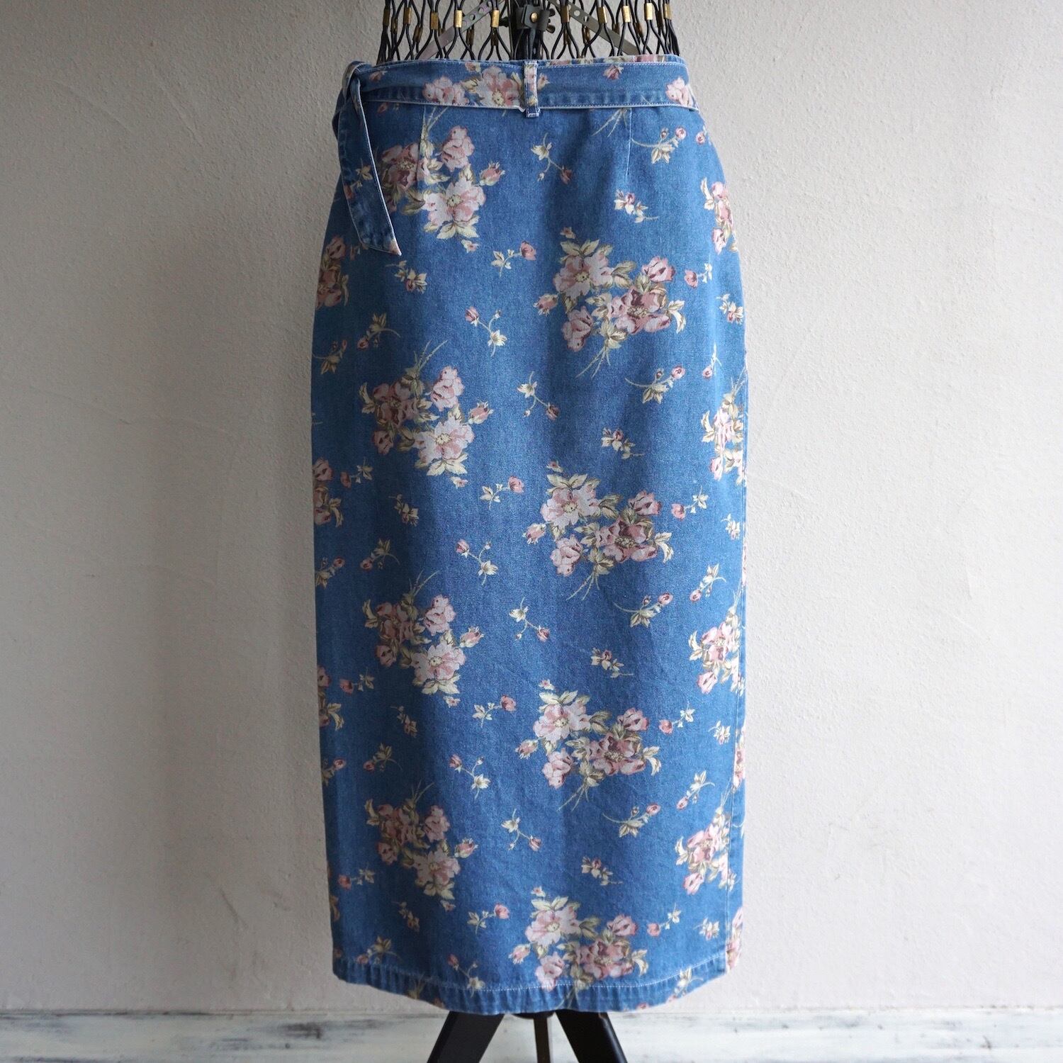 1990’s [paul harris denim] フローラル柄 ロング&タイトシルエット ラップデニムスカート ブルー 表記(women's S) 花柄