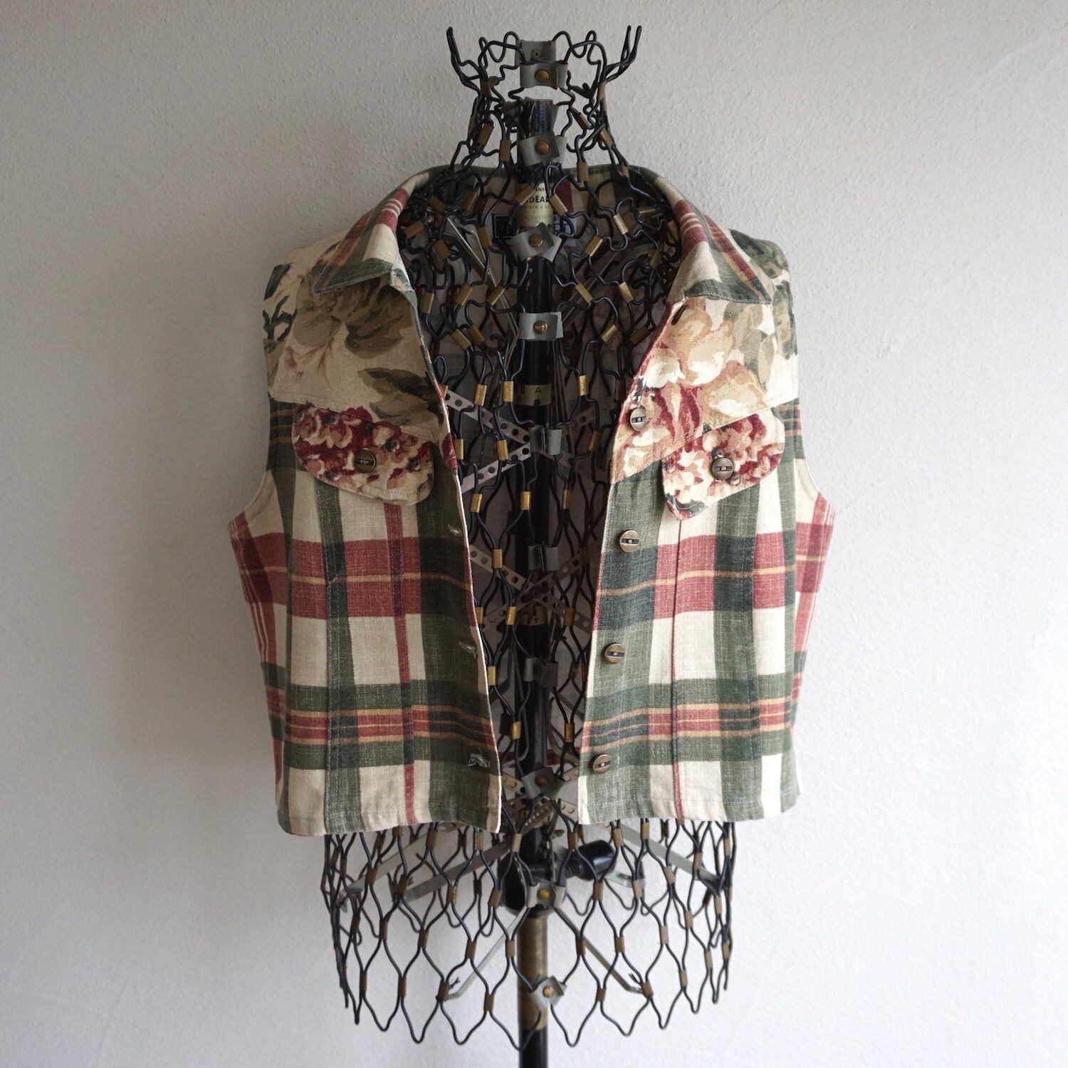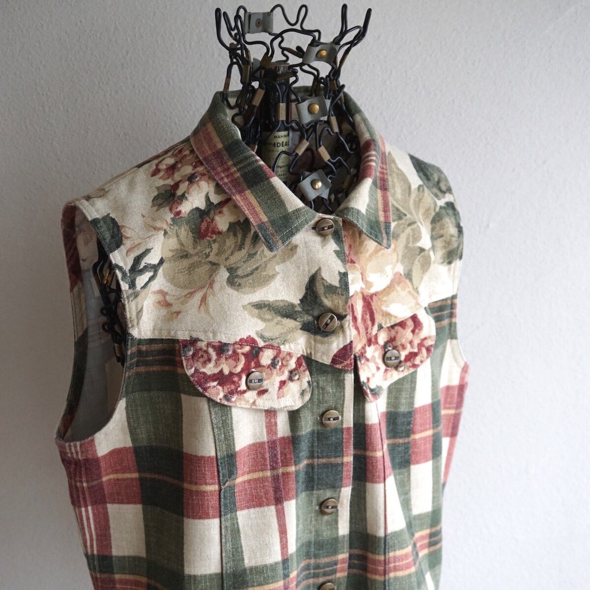 カラーリングの良いフローラル×マドラスチェックの、コットントラッカーベスト。