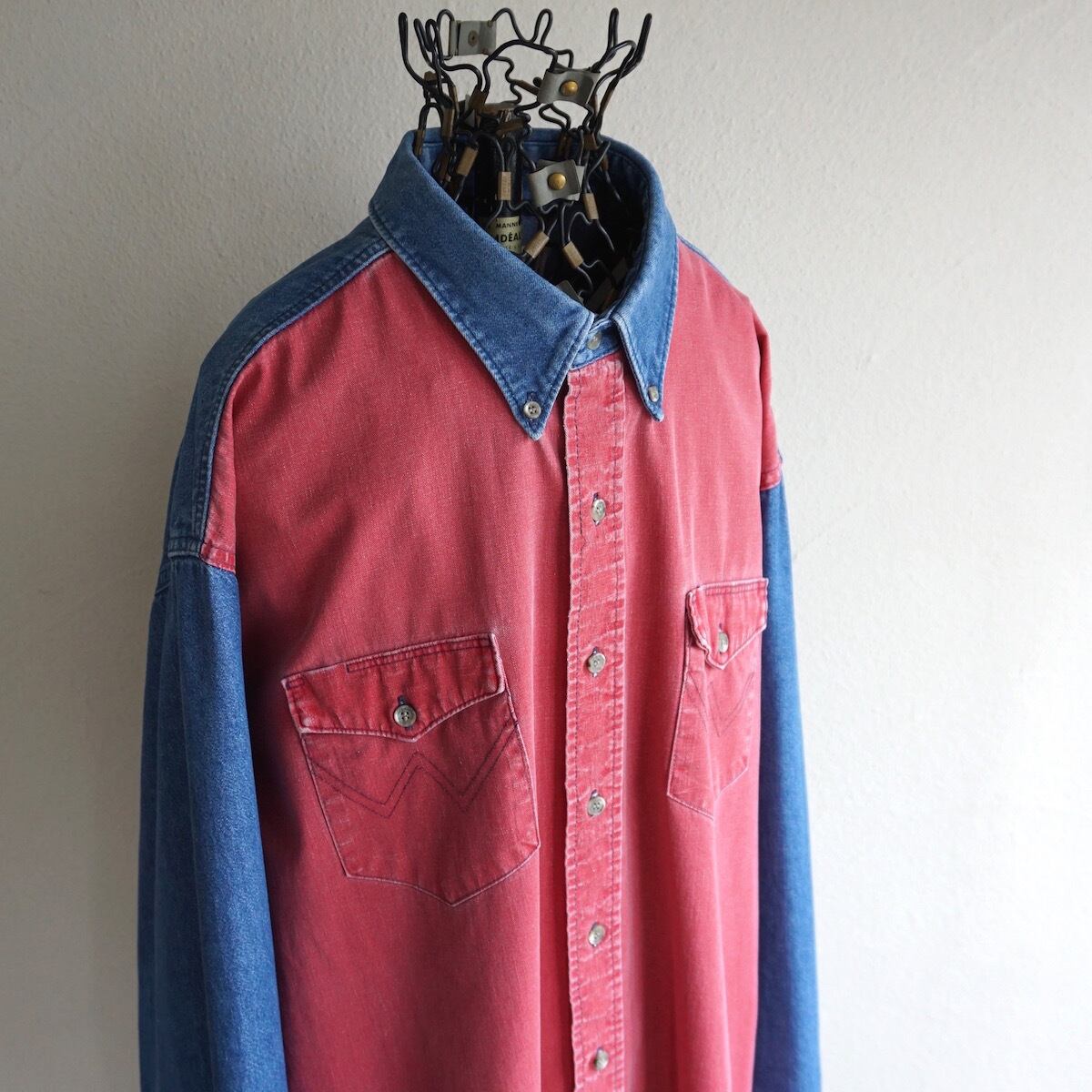 1990’s [Wrangler] 切り替え ボタンダウンデニムシャツ ブルー×レッド 実寸(XL程度) ラングラー