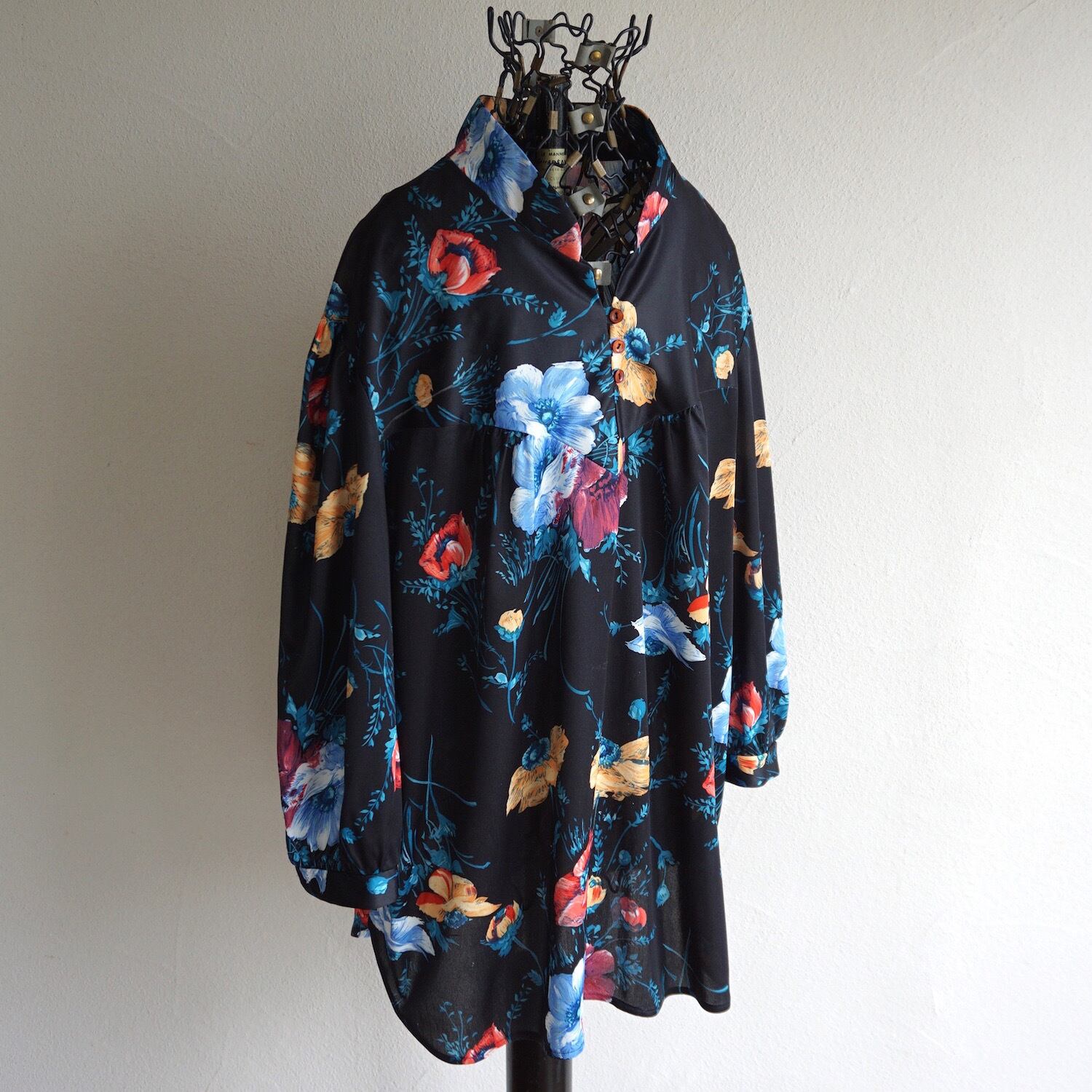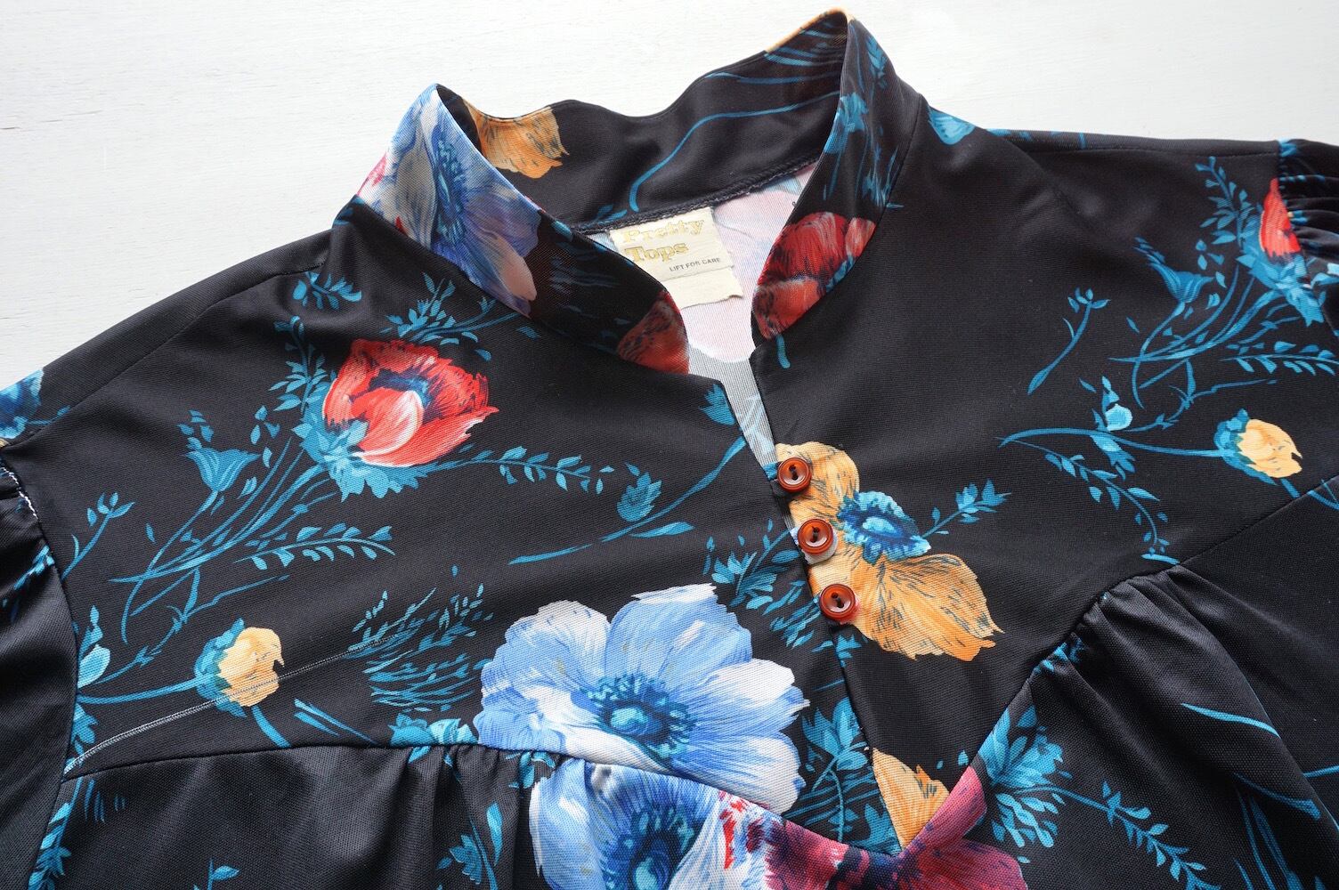 1970’s [Pretty Tops] マンダリンカラー&3/4スリーブ スモック型ポリエステルブラウス ブラック×フローラル柄 実寸(women's L程度) 花柄 ヴィンテージ | MAGNOLIA WEBSTORE
