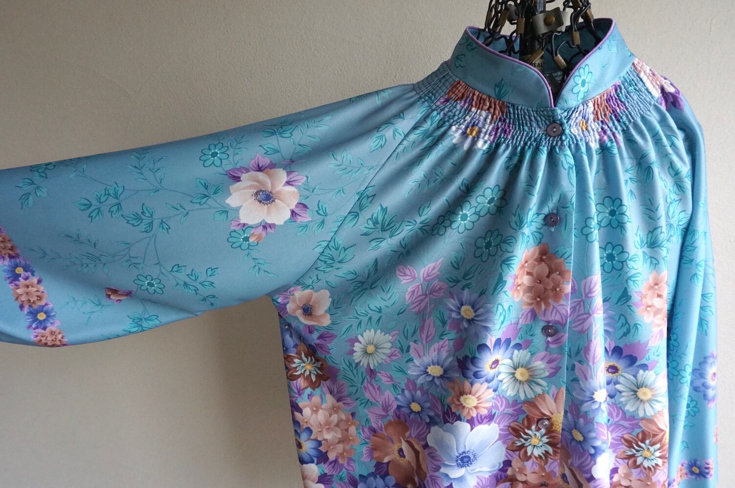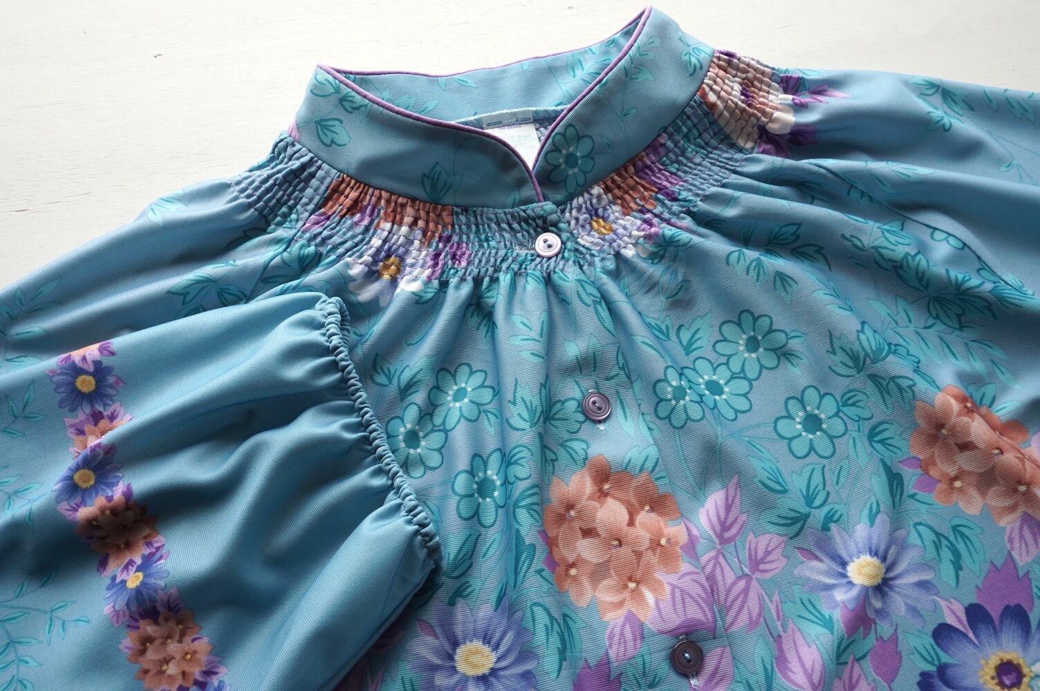 1970’s [Alika of California] マンダリンカラー&3/4スリーブ スモック型ポリエステルブラウス ターコイズ×フローラル柄 実寸(women's L程度) 花柄 ヴィンテージ | MAGNOLIA WEBSTORE